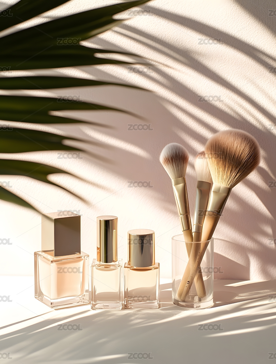 美妆用品,化妆刷,粉扑,光影,静物,插画,美妆主题,物品组合,柔和色调,简约