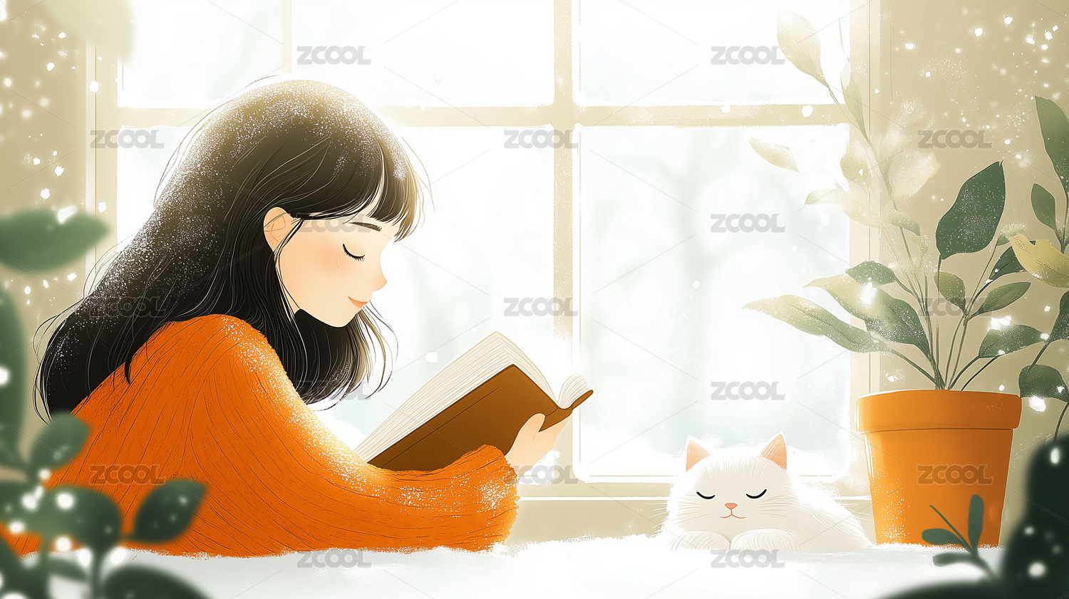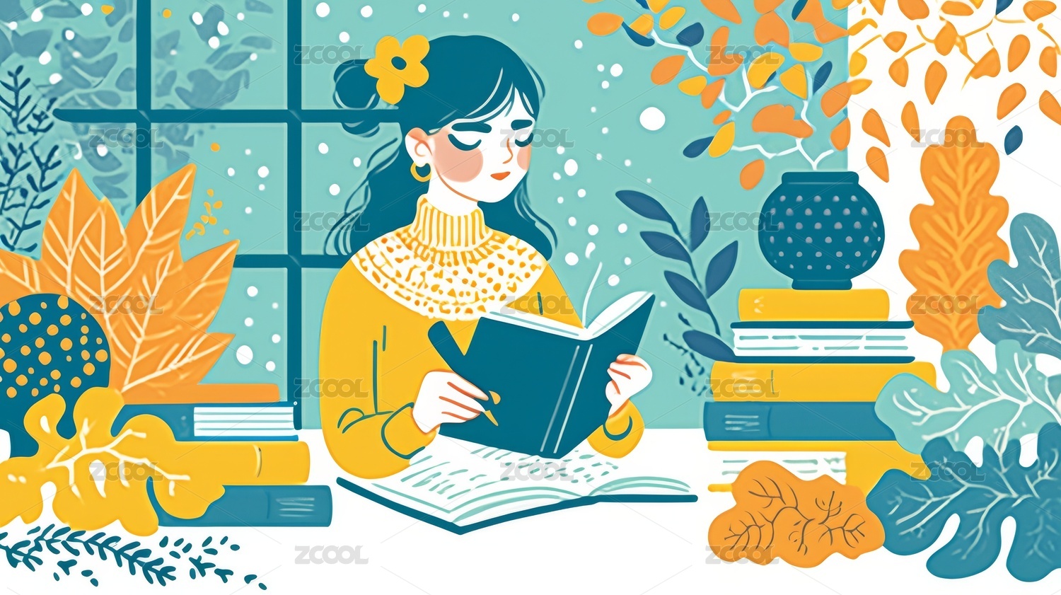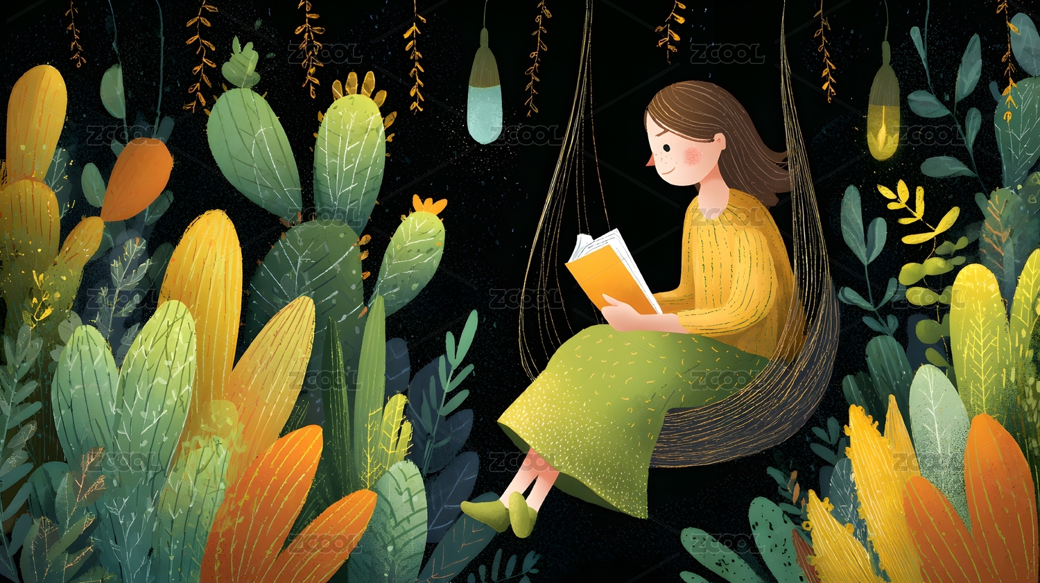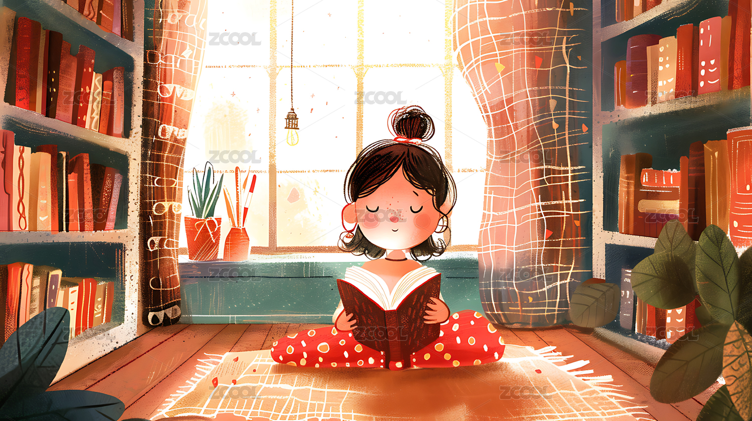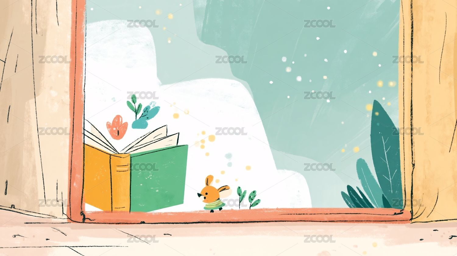 女孩,小动物,书本,插画,童趣,奇幻,场景,阅读,温馨,自然
