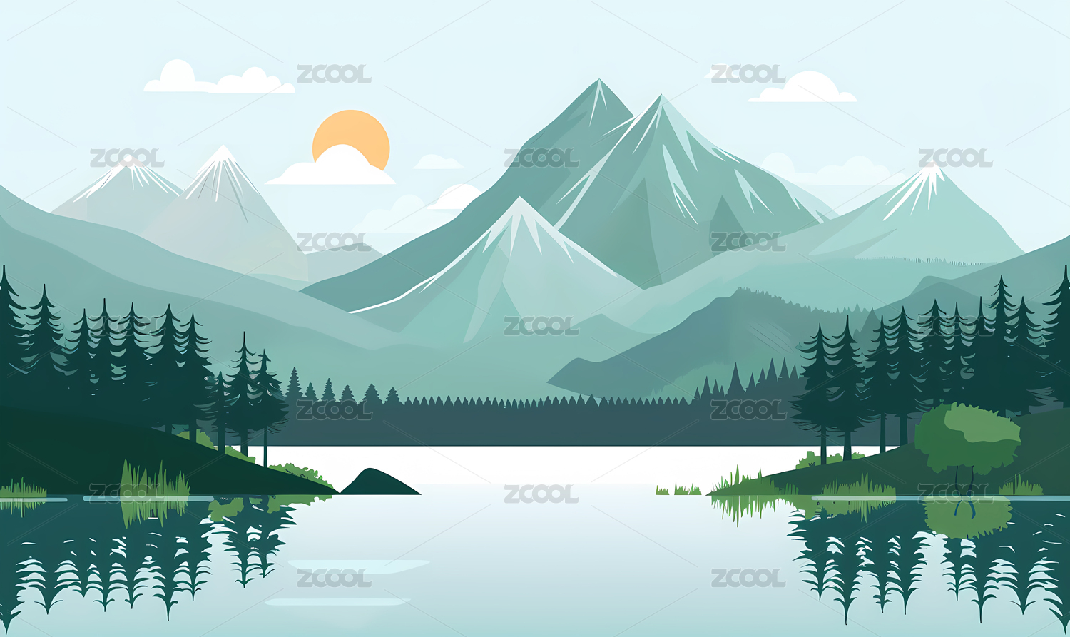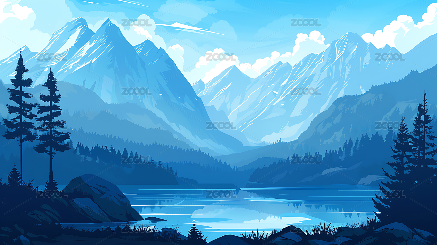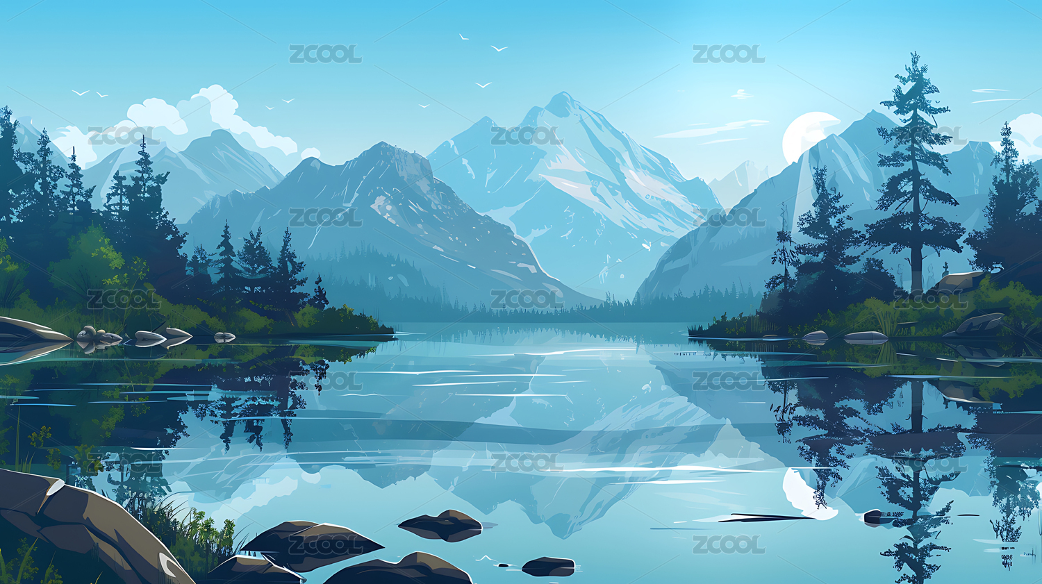 风景插画雪山湖泊山水画
