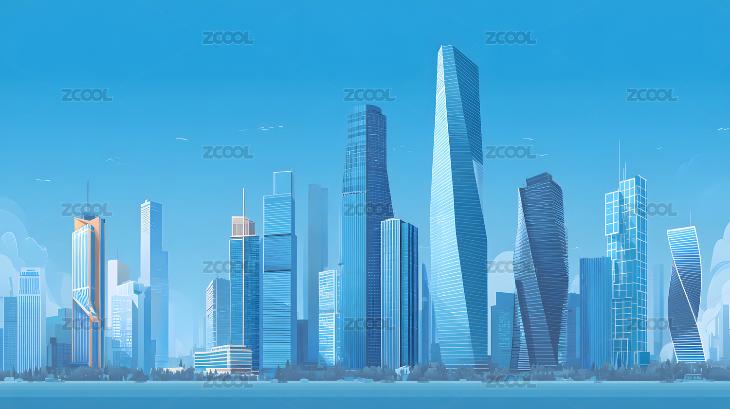 城市,天际线,建筑,蓝色背景,线条,简约风格,现代感,高楼,波浪线条