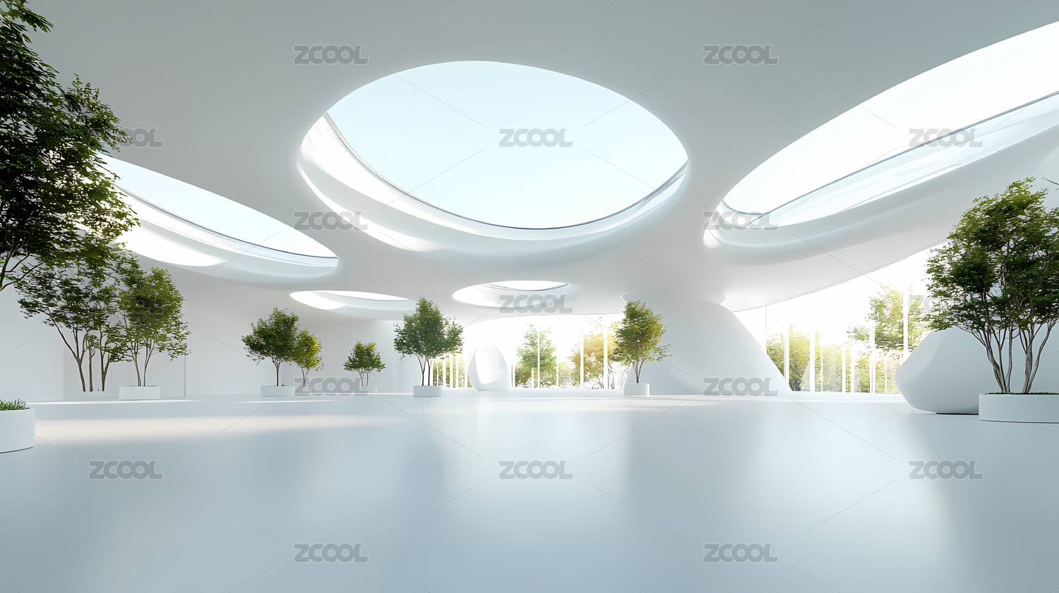 白色弯曲科技感展台有巨大的透明落地窗背景