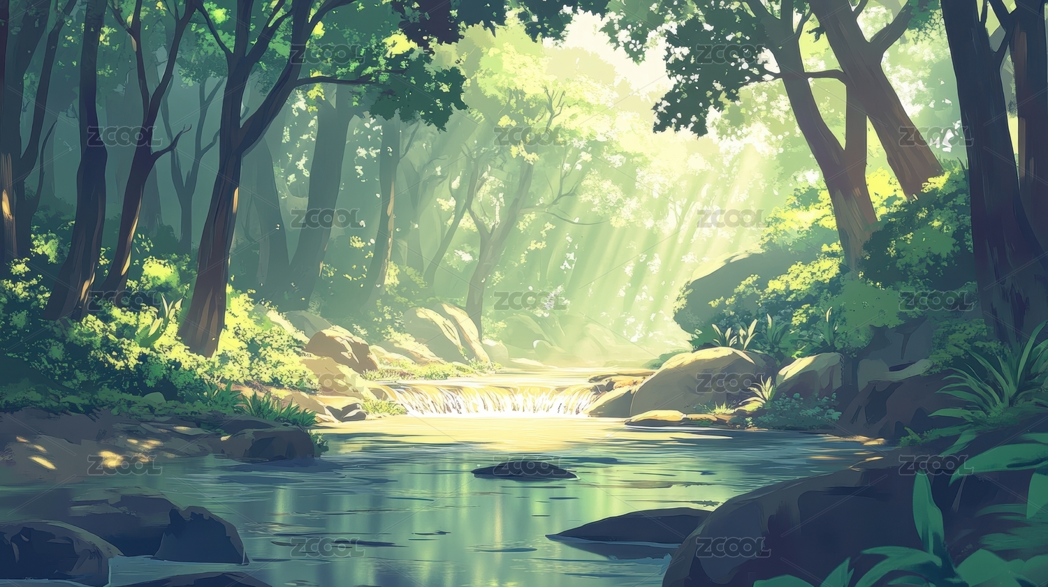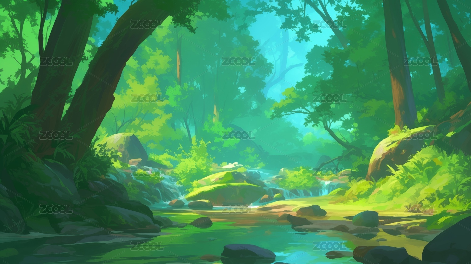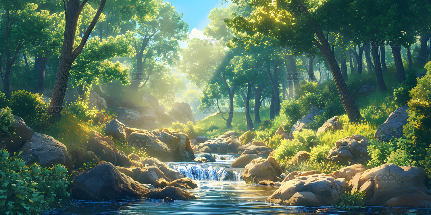 幽静绿色茂密森林中的清澈小溪插画绘画