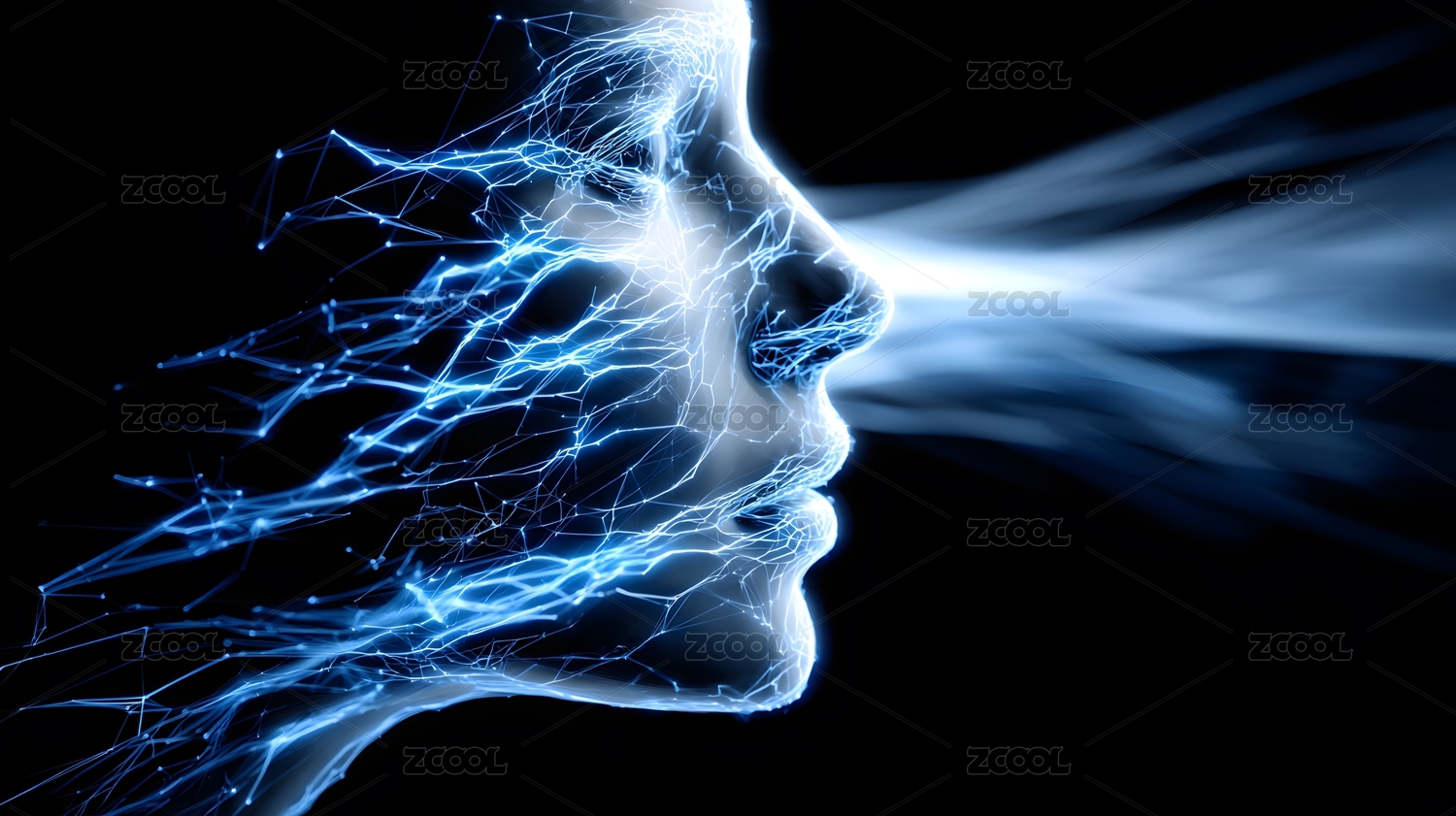 蓝色发光粒子生成人脸抽象虚拟人工智能插画