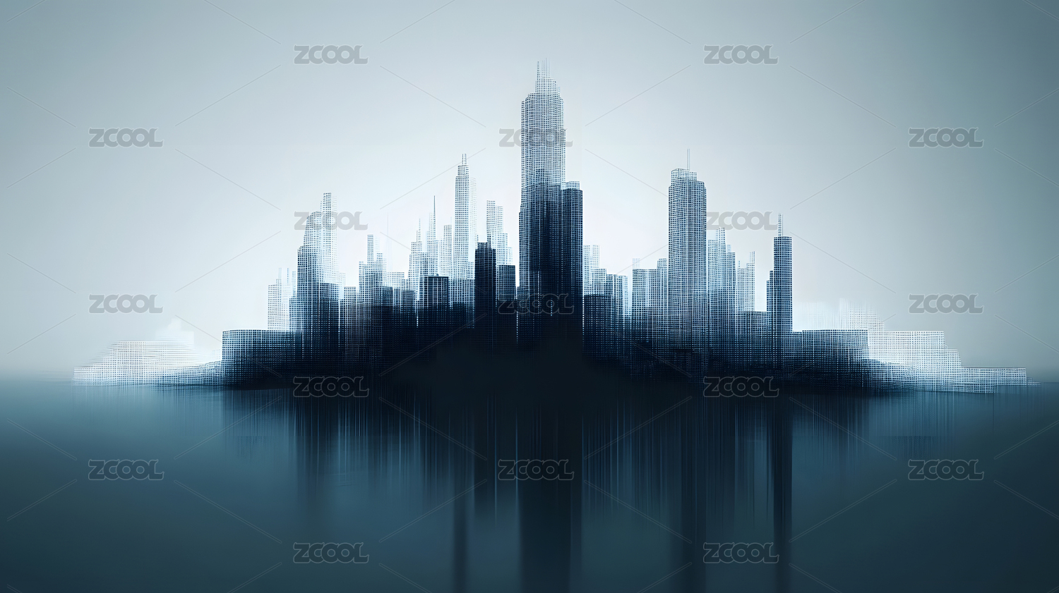 抽象数字城市天际线与水面倒影