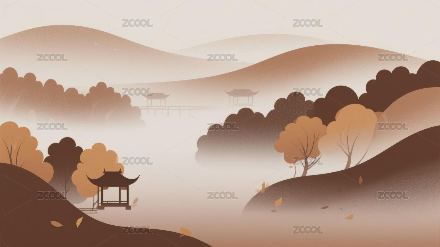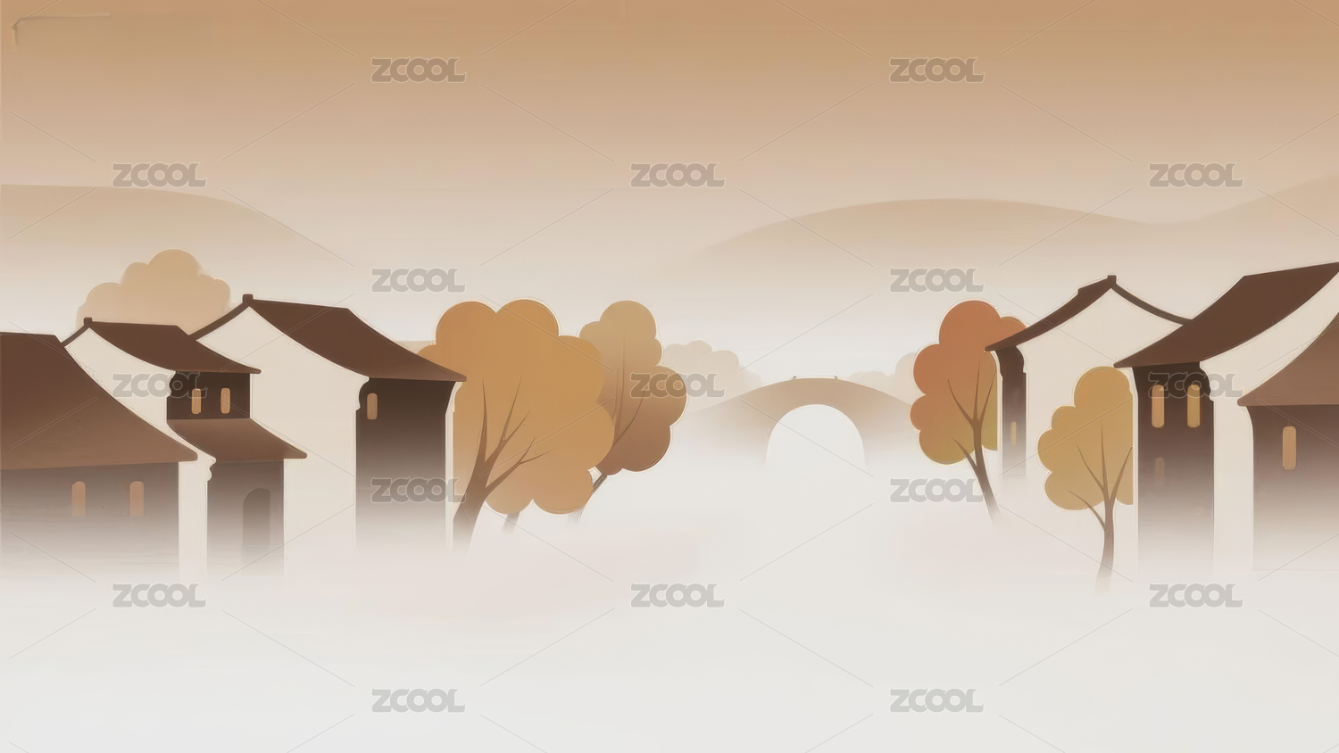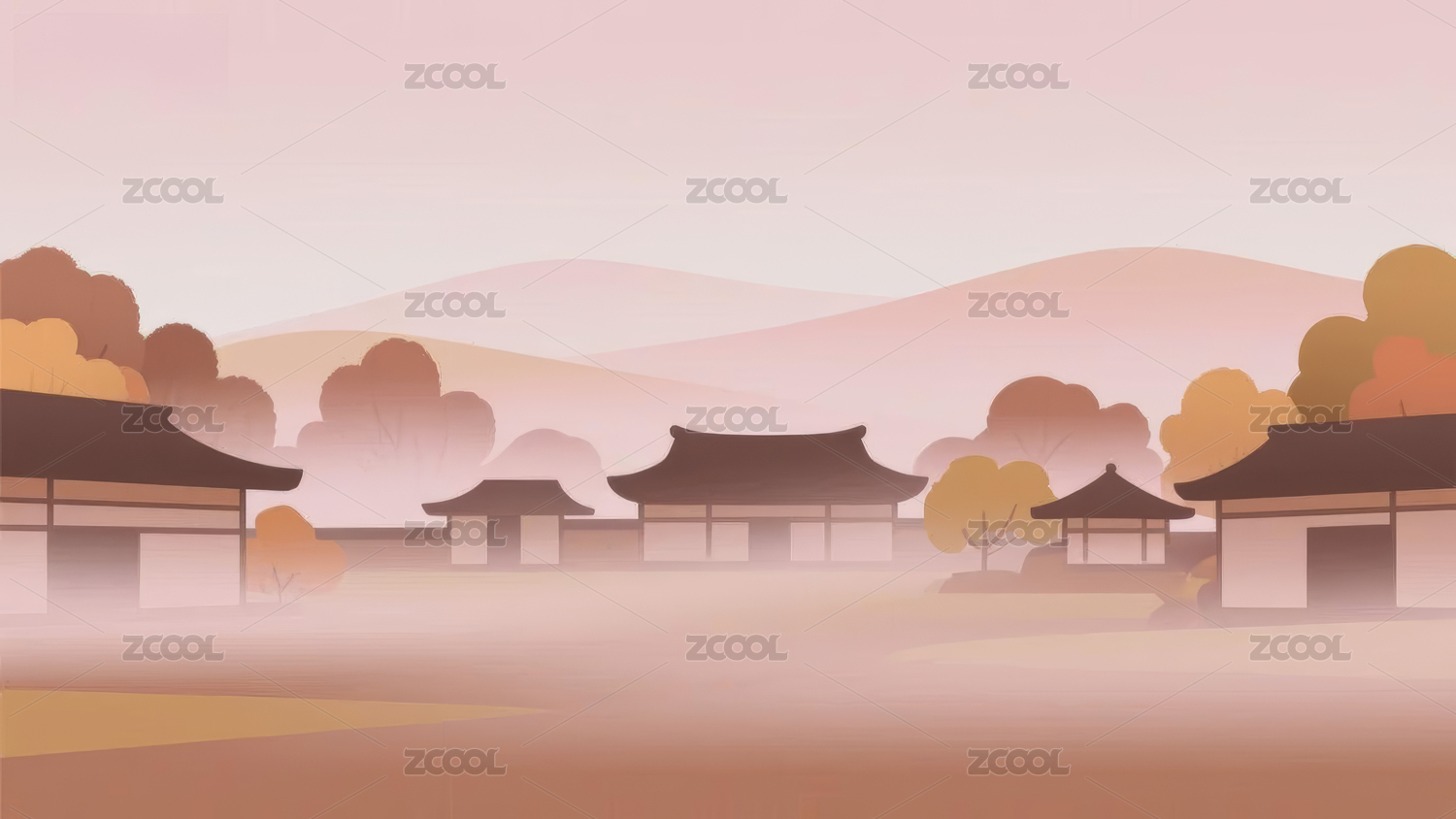 山水古建筑晨雾