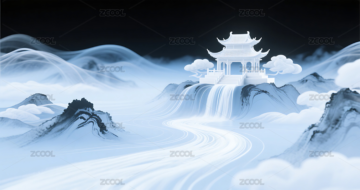 山水, 瀑布, 山峰, 云雾, 建筑, 亭台, 自然, 风景, 艺术, 传统