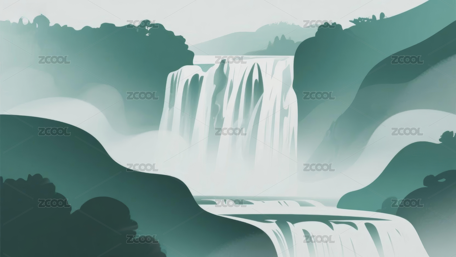 山水瀑布晨雾