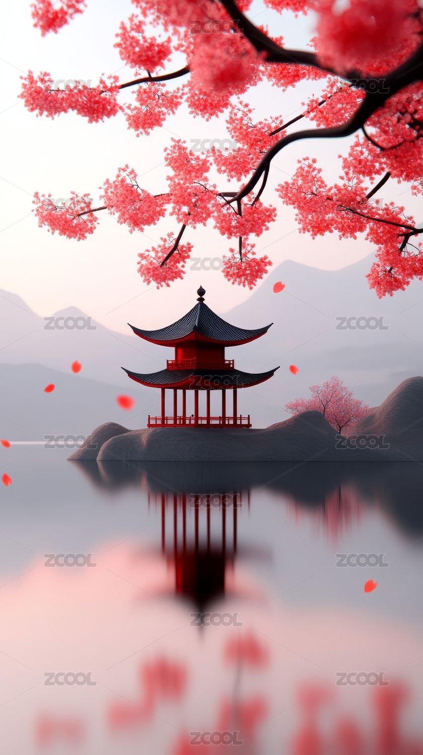 静谧,氛围,红叶,建筑,庭院,水面,倒影,光影,灯光,景色