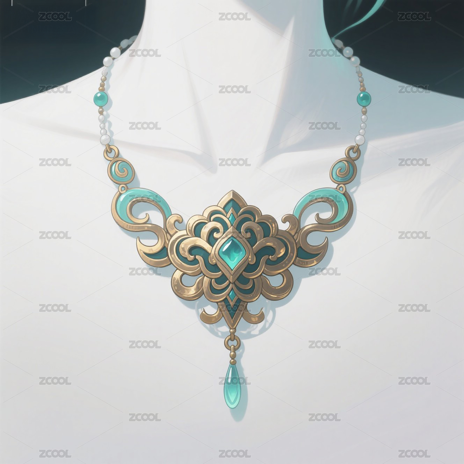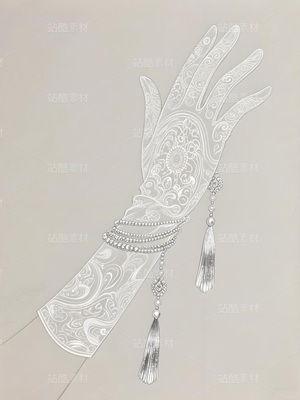 本系列以敦煌藻井璎珞纹样为灵感,将千年壁画中的繁复线条与华丽装饰融入现代高定设计。礼服以银白色为主调,通过立体刺绣与镂空工艺重现璎珞层叠的细腻质感,腰间流转的纹样如星河倾泻,与廓形外套的流苏下摆形成虚实呼应。裤装侧缝嵌入金属链饰,手套与配饰均缀以凿刻纹路,在纯白背景下凸显神圣与未来感的碰撞。传统符号被解构为极简剪裁与夸张轮廓,既保留敦煌艺术的恢弘,又赋予时装超越时空的科幻诗意。