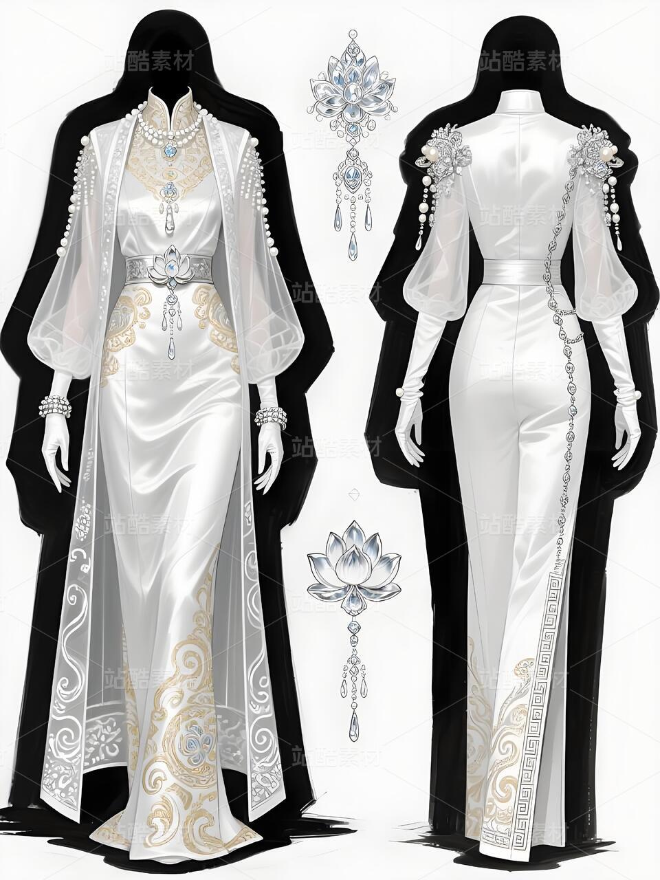 本系列从敦煌藻井璎珞中汲取灵感,将千年纹样解构为现代高定语言。银白色礼服以立体刺绣重现璎珞层叠的华丽感,流苏与镂空蕾丝暗藏藻井几何韵律。廓形外套的肩部纹样如鎏金倾泻,与裤侧金属链饰形成虚实呼应。手套与配饰凿刻细密纹路,在白色背景下凸显神圣与未来的碰撞。传统图腾通过极简剪裁与科技感面料重生,既保留敦煌艺术的磅礴,又赋予时装穿越时空的星际诗意。