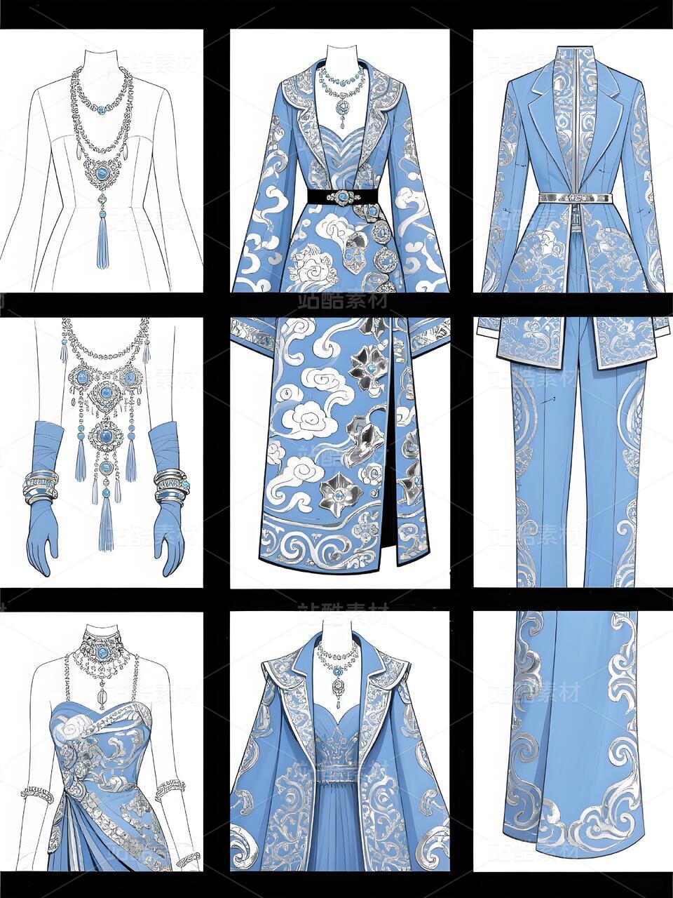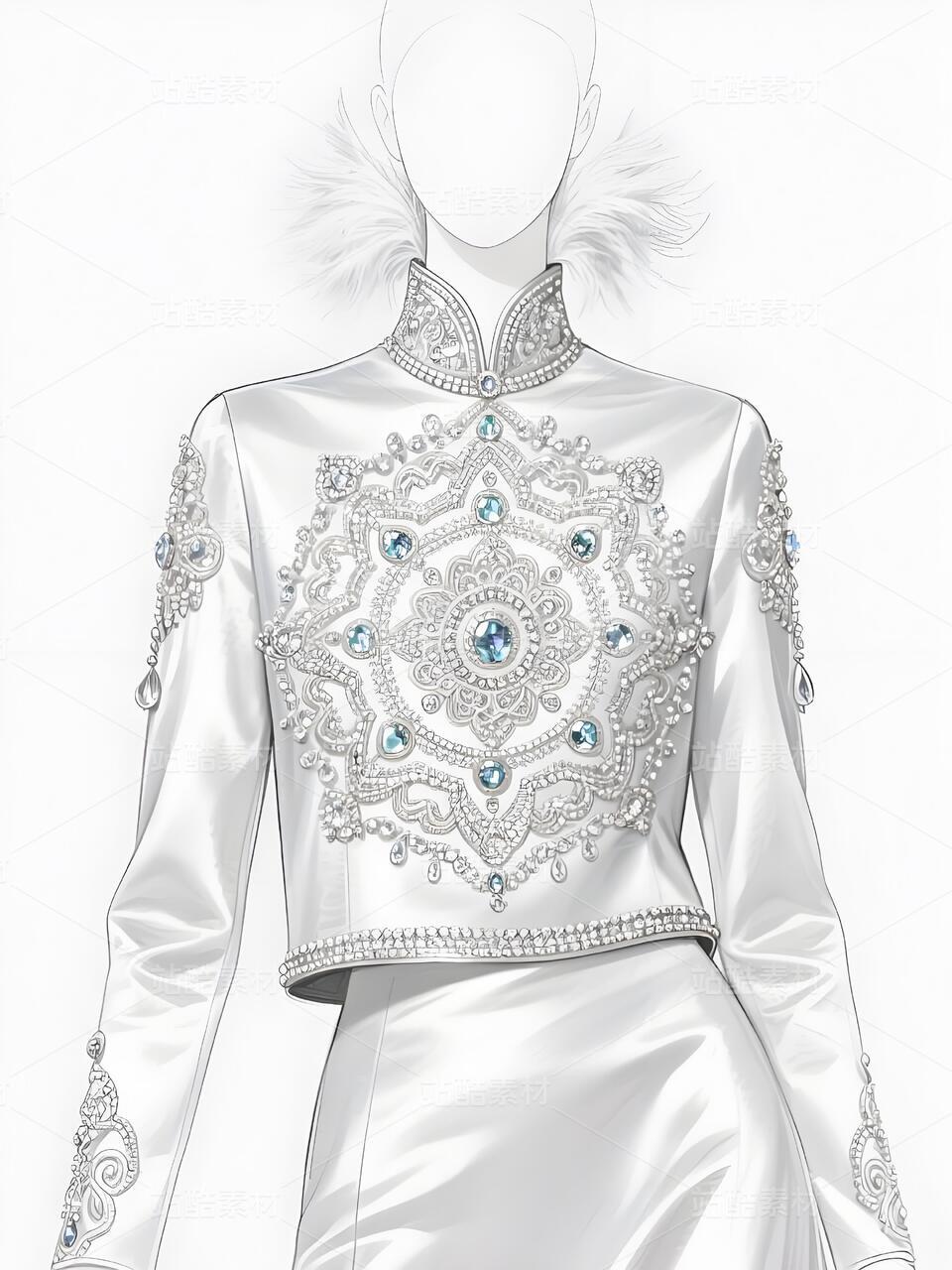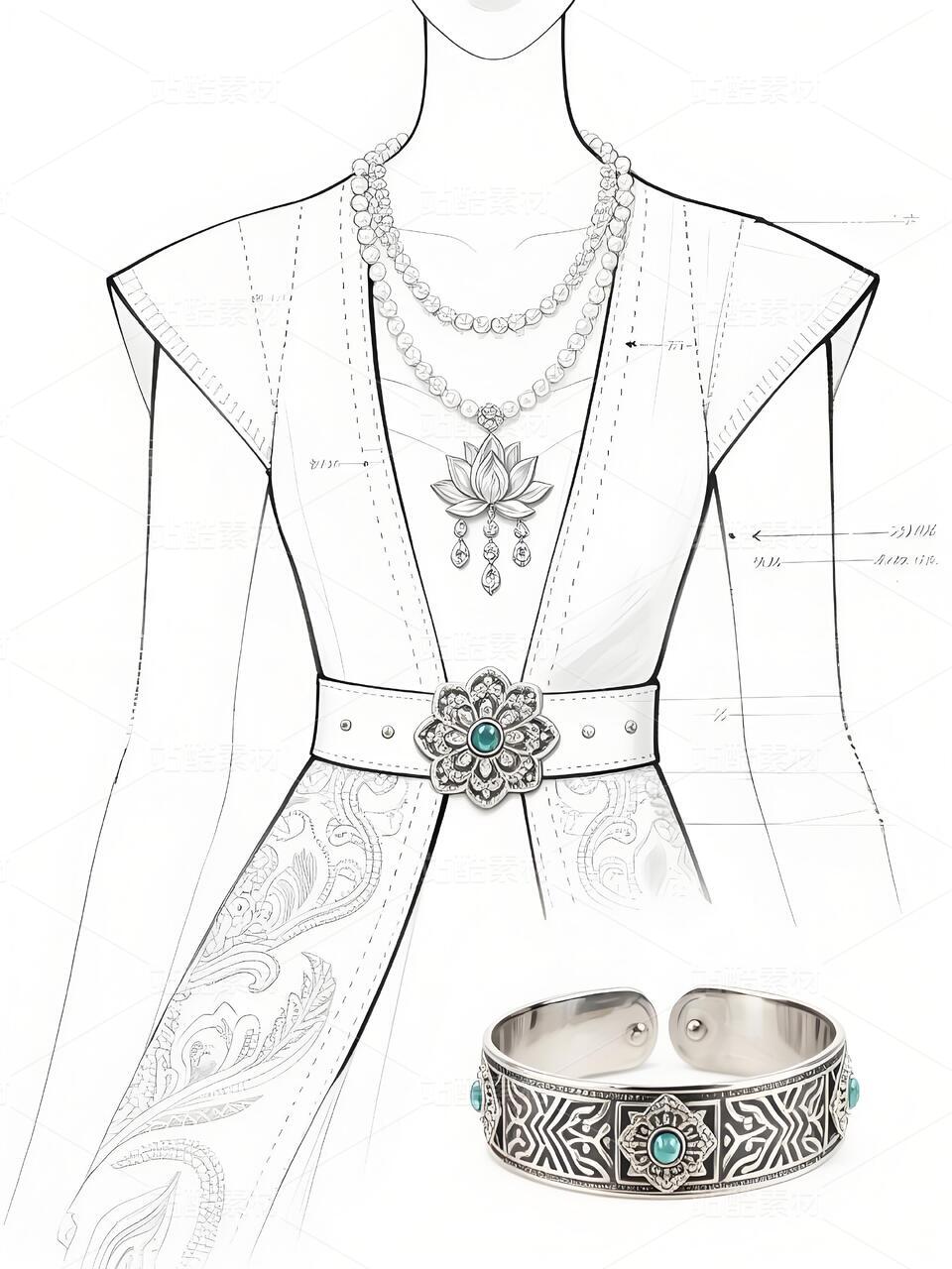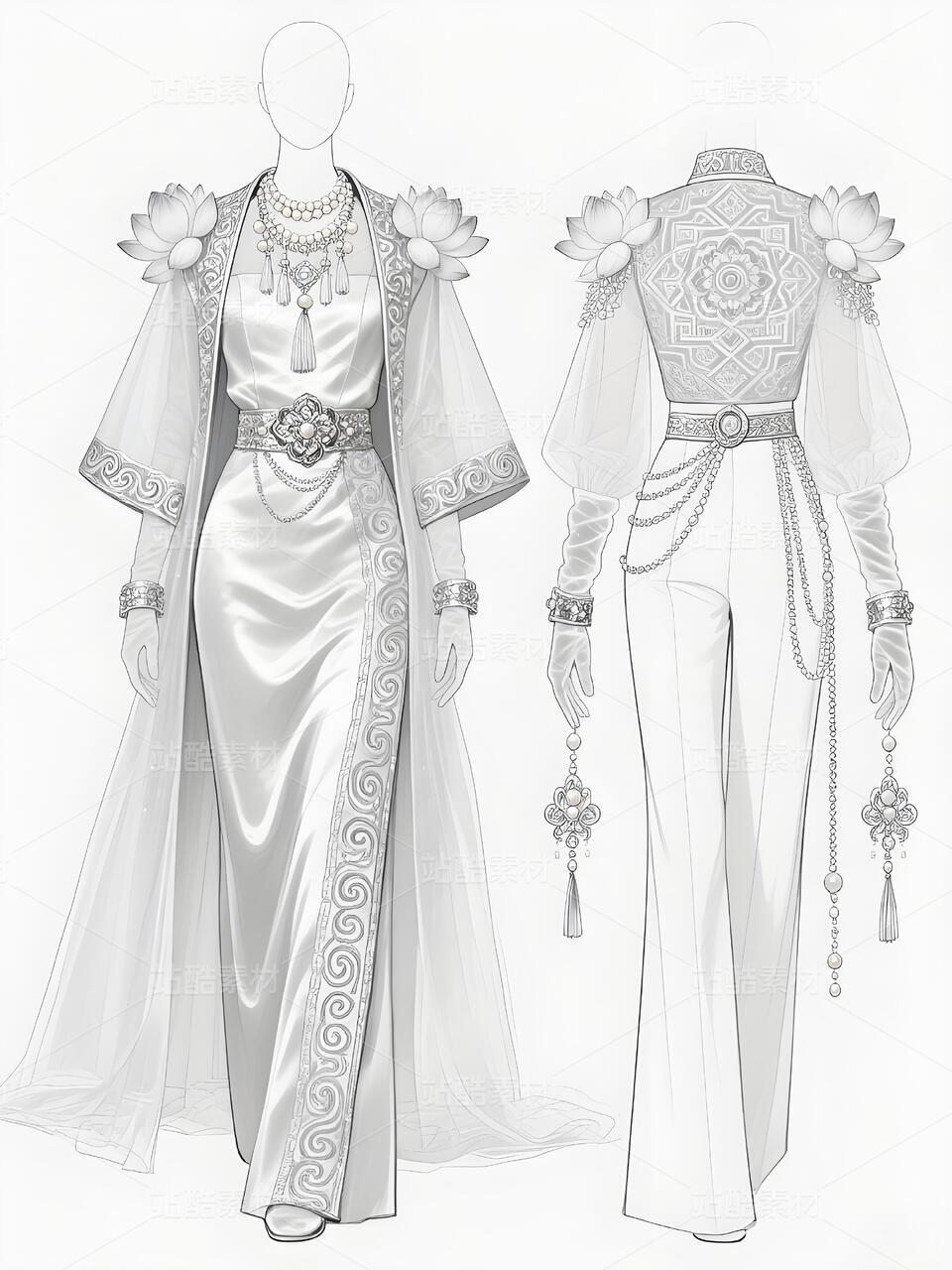 本系列提取敦煌藻井璎珞的层叠美学,以银白色调重构古老图腾。礼服采用不对称廓形,肩部至裙摆铺陈精密凿刻的璎珞纹刺绣,光线流转间仿若壁画中浮动的银河。外套以挺拓面料雕琢藻井几何线条,内搭透纱长裤侧缝垂落金属链珠,与镂空手套形成虚实对话。配饰延续凿刻银器质感,将敦煌纹样解构为未来感符号。白背景下,传统纹样与太空银光泽碰撞,缔造一场穿越千年的星际朝圣。