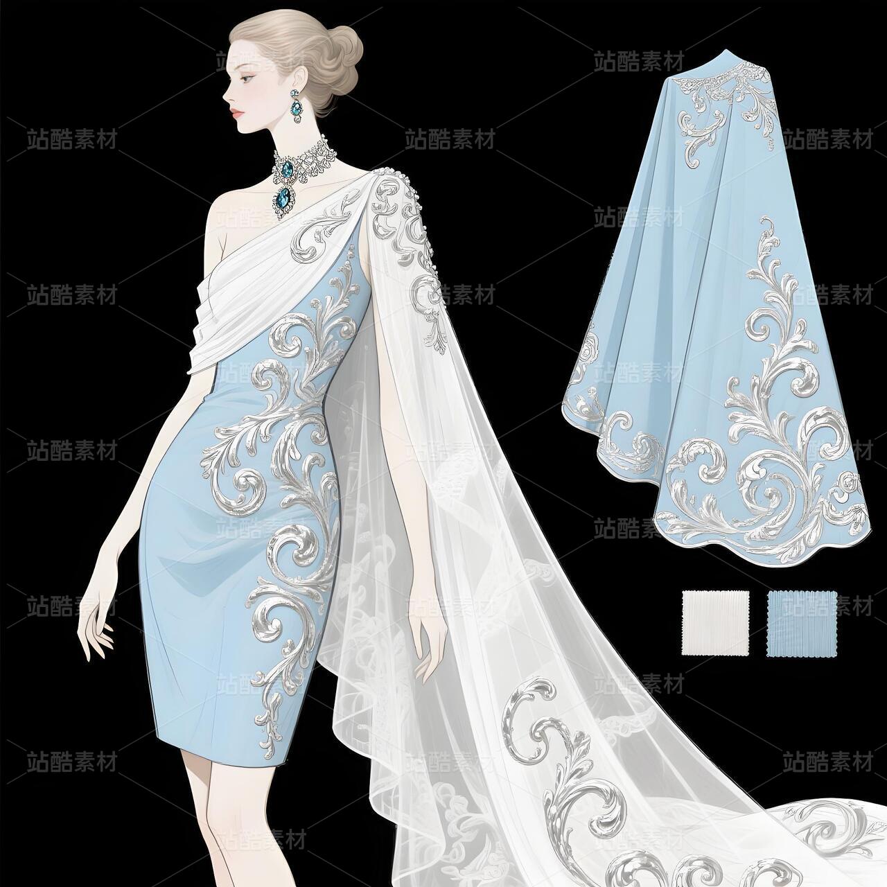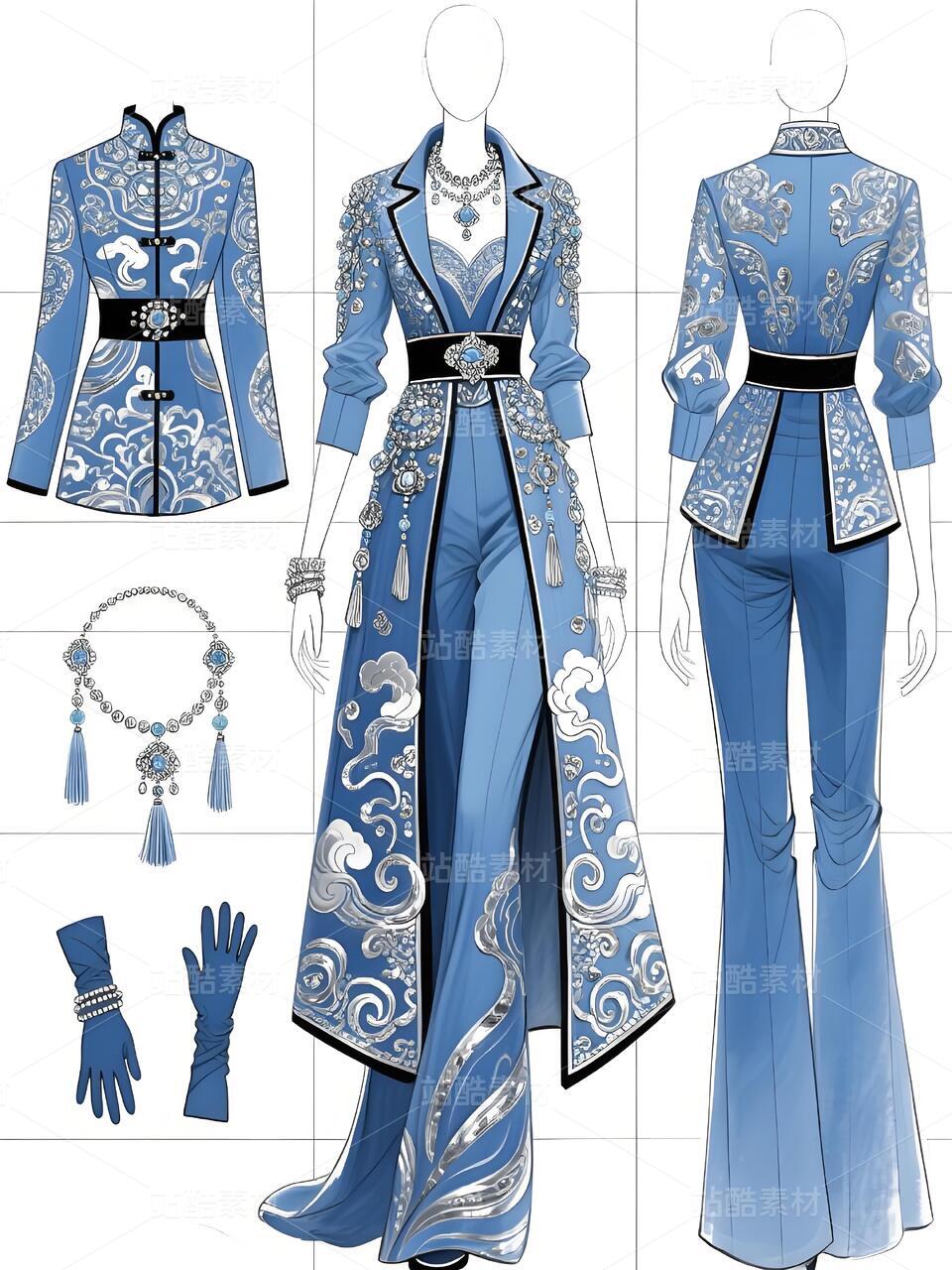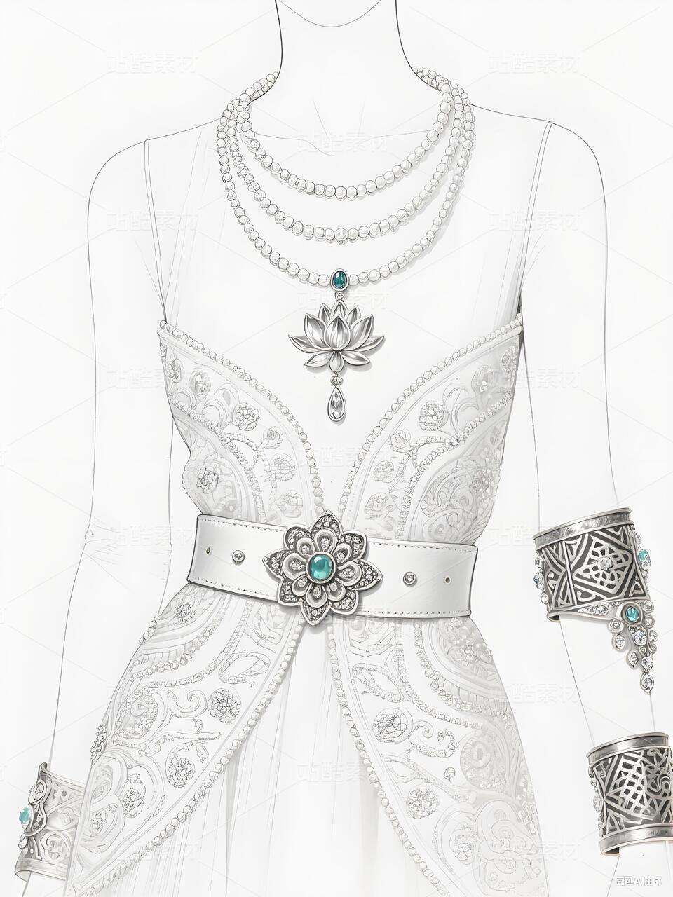 本系列提取敦煌藻井璎珞的层叠美学,以银白色调重构古老图腾。礼服采用不对称廓形,肩部至裙摆铺陈精密凿刻的璎珞纹刺绣,光线流转间仿若壁画中浮动的银河。外套以挺拓面料雕琢藻井几何线条,内搭透纱长裤侧缝垂落金属链珠,与镂空手套形成虚实对话。配饰延续凿刻银器质感,将敦煌纹样解构为未来感符号。白背景下,传统纹样与太空银光泽碰撞,缔造一场穿越千年的星际朝圣。