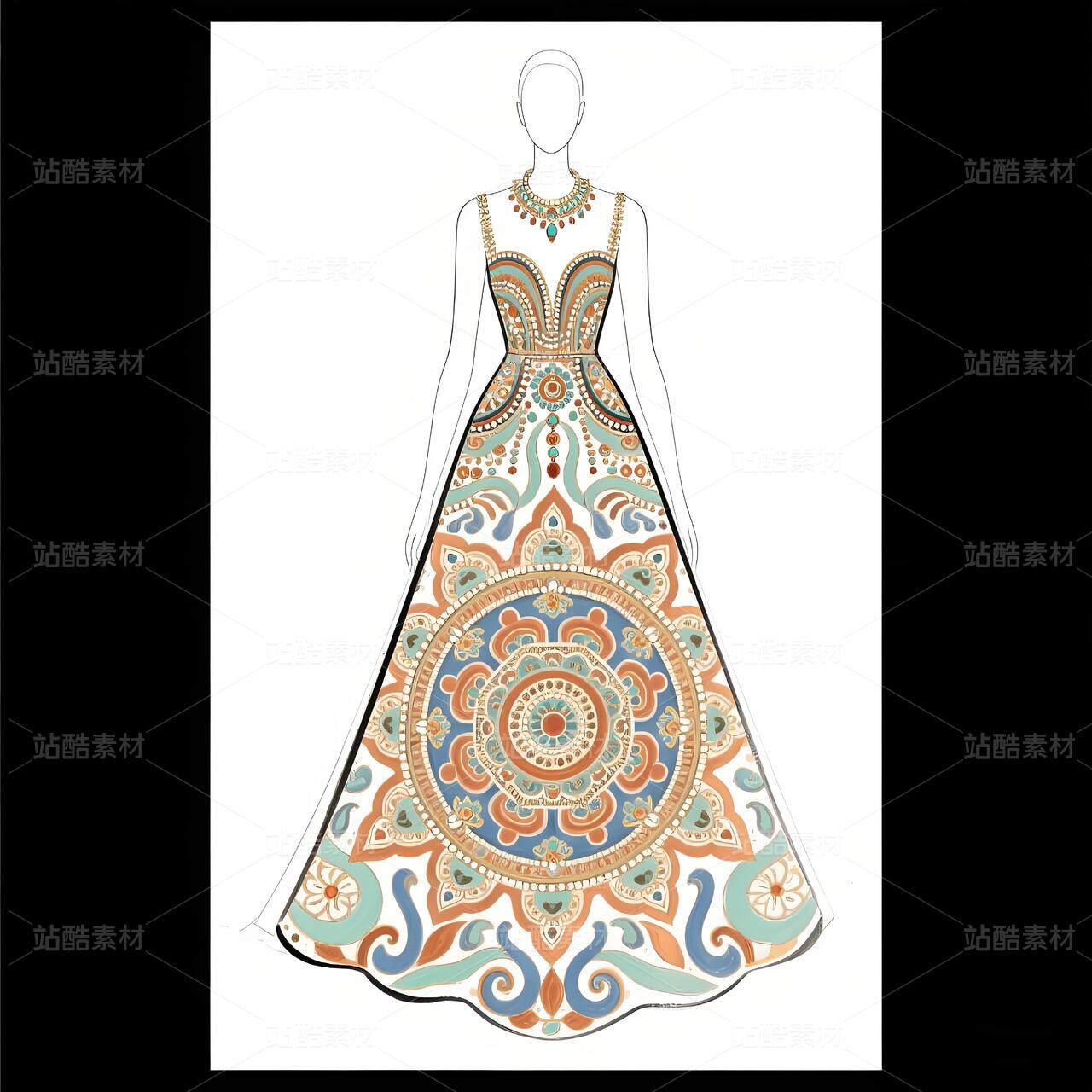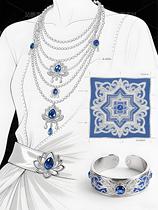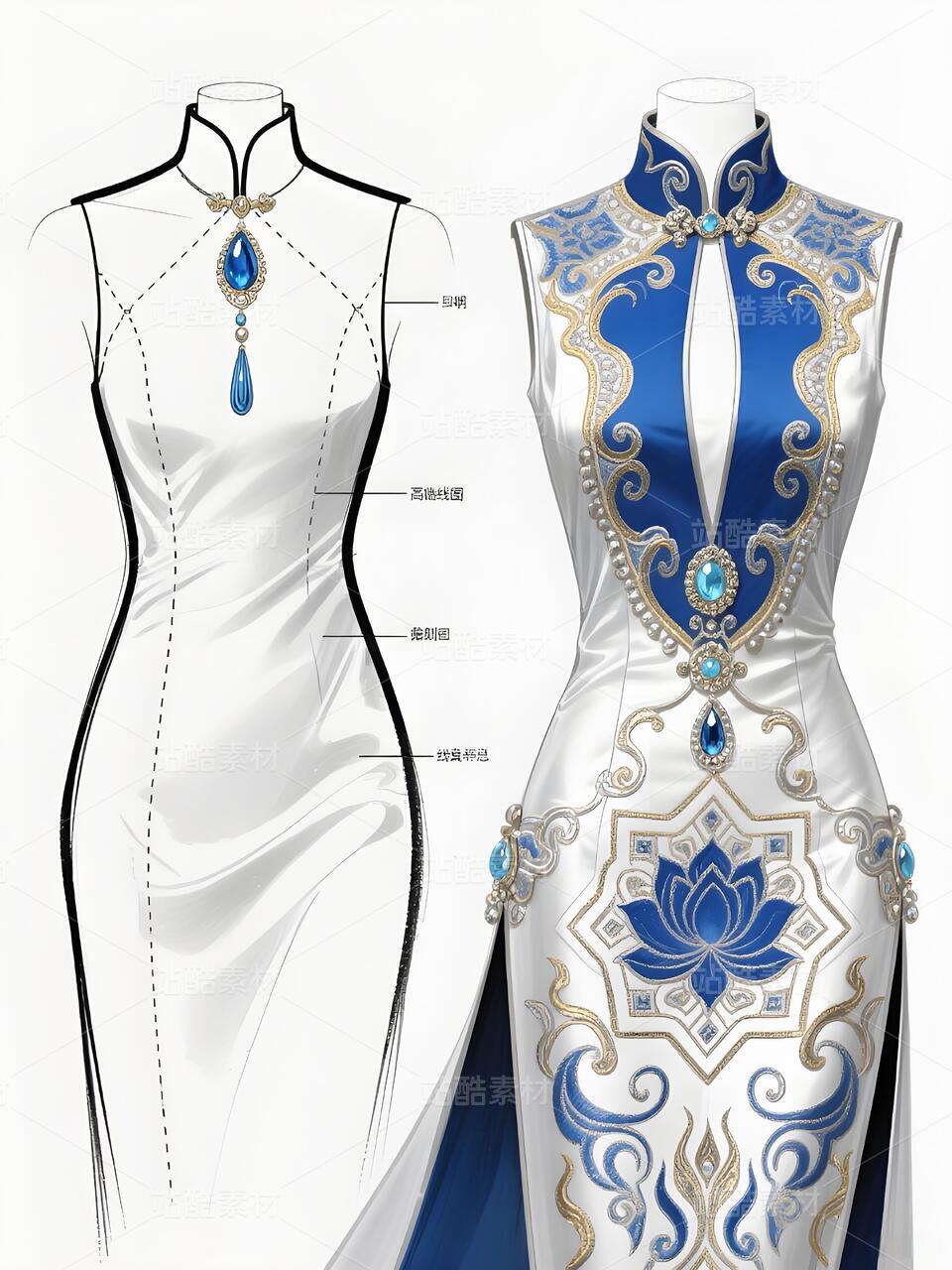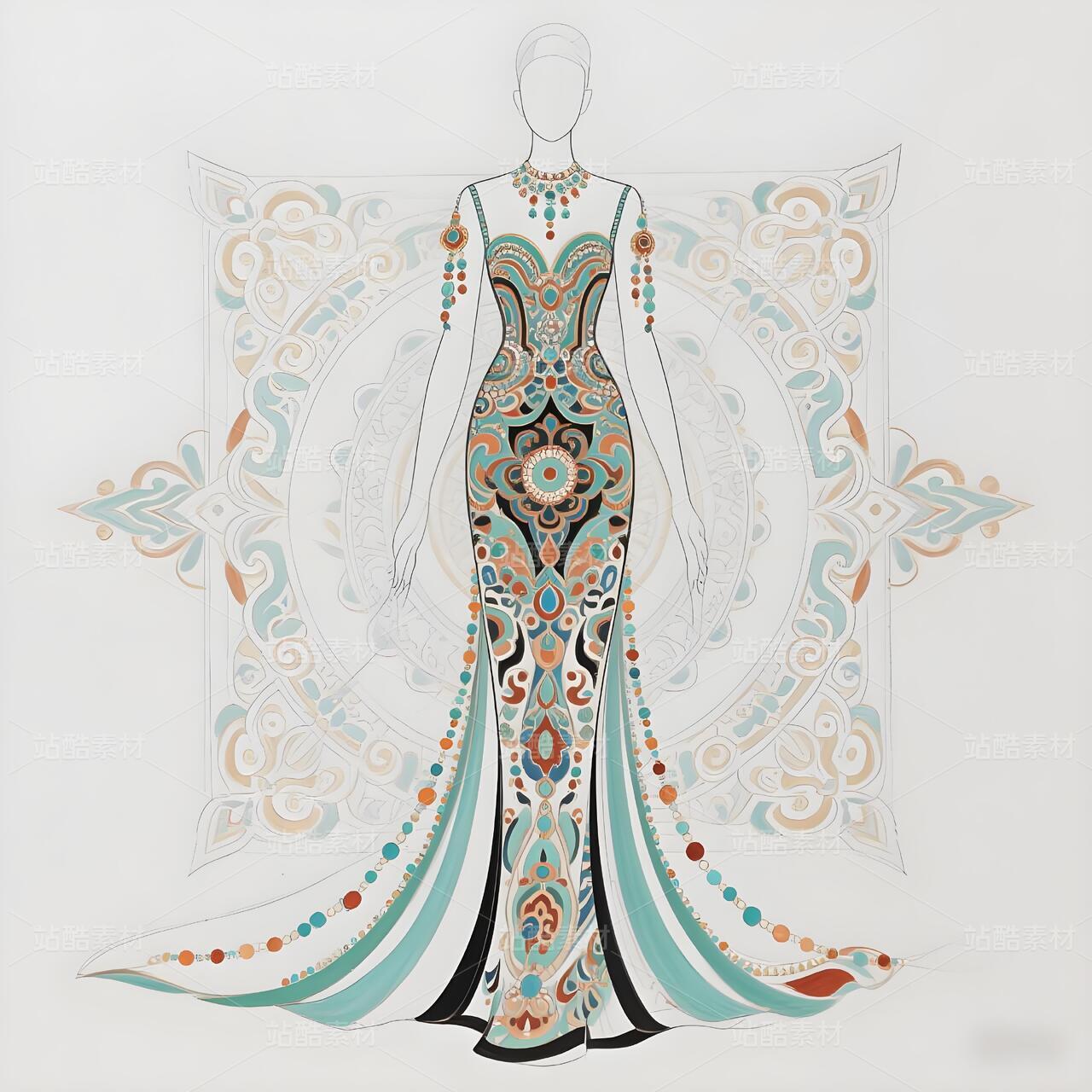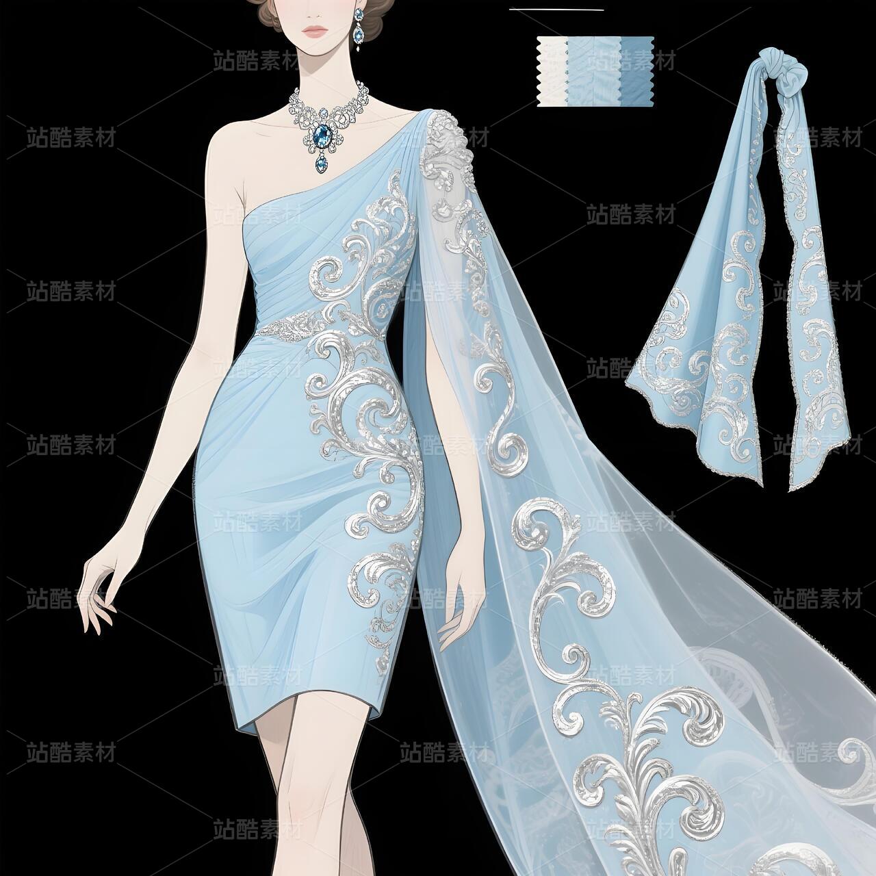 本系列提取敦煌藻井璎珞的层叠美学,以银白色调重构古老图腾。礼服采用不对称廓形,肩部至裙摆铺陈精密凿刻的璎珞纹刺绣,光线流转间仿若壁画中浮动的银河。外套以挺拓面料雕琢藻井几何线条,内搭透纱长裤侧缝垂落金属链珠,与镂空手套形成虚实对话。配饰延续凿刻银器质感,将敦煌纹样解构为未来感符号。白背景下,传统纹样与太空银光泽碰撞,缔造一场穿越千年的星际朝圣。