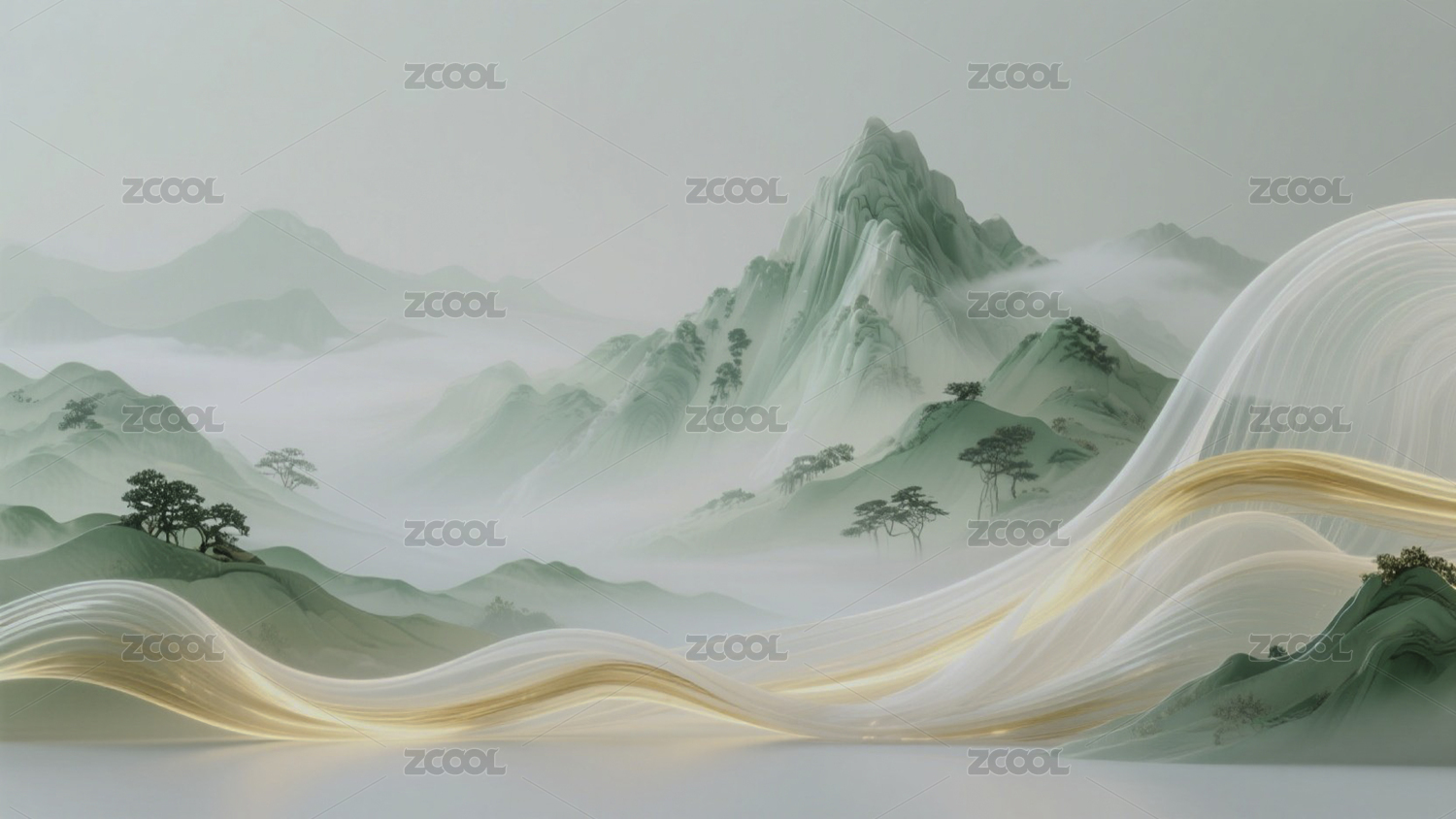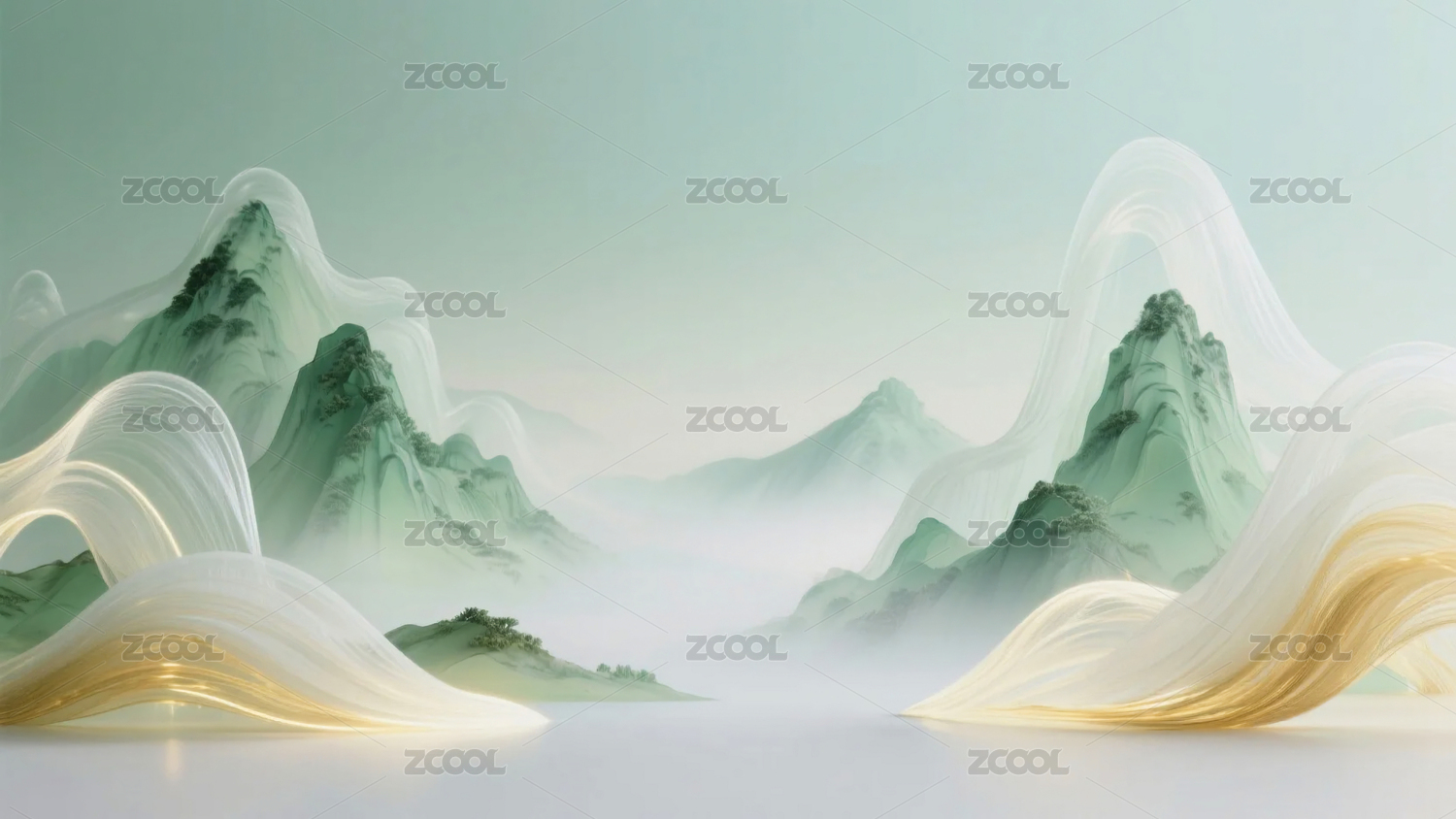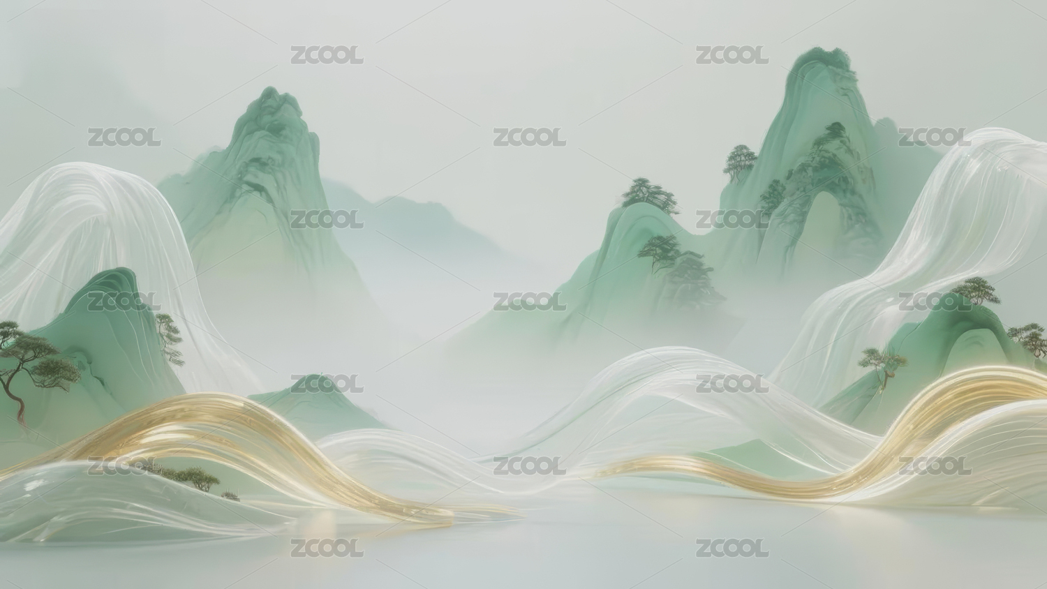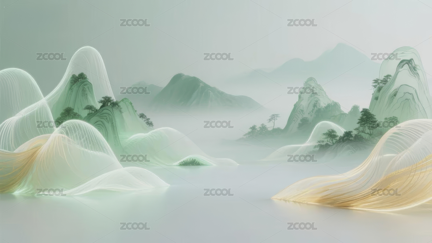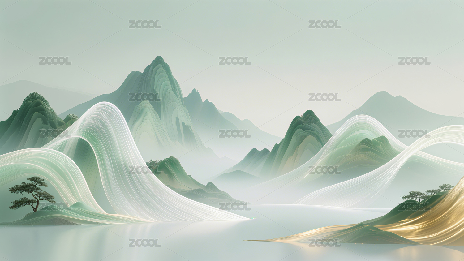 新中式梦幻绿白金色渐变山水画