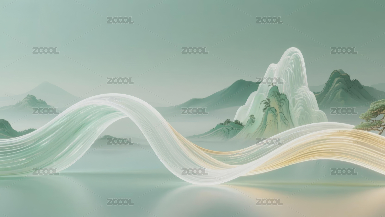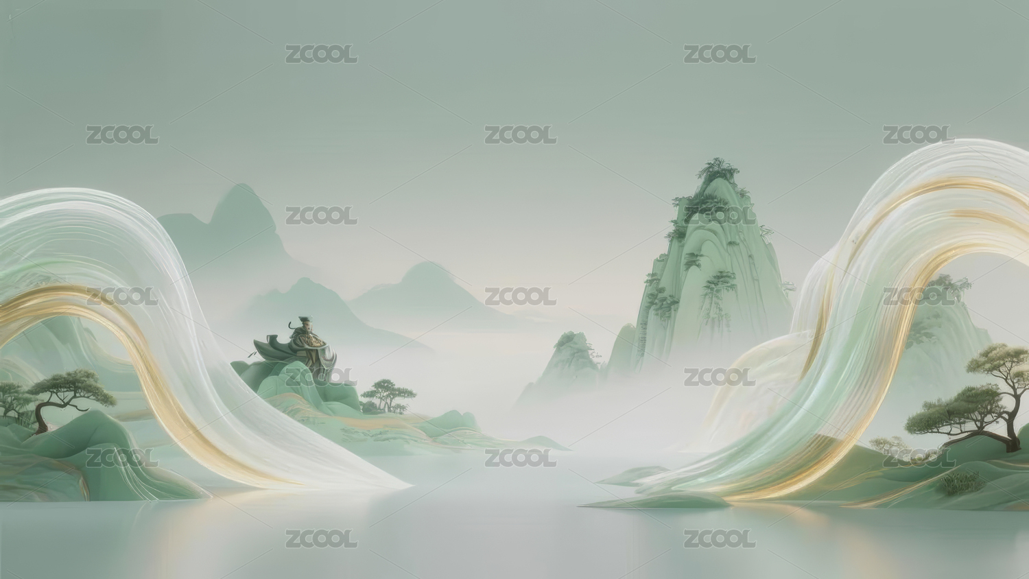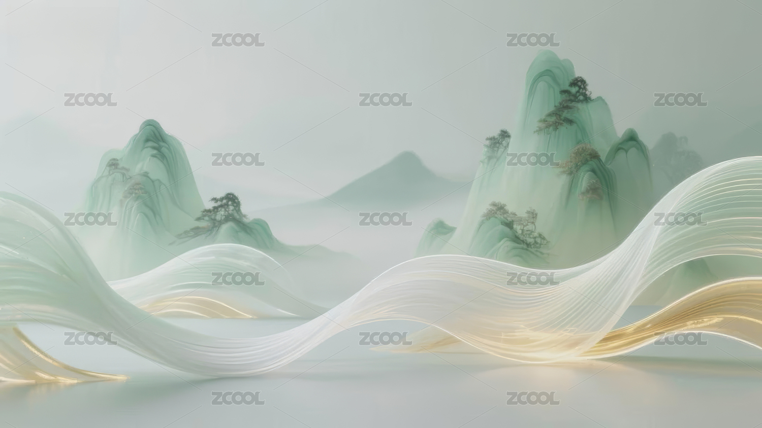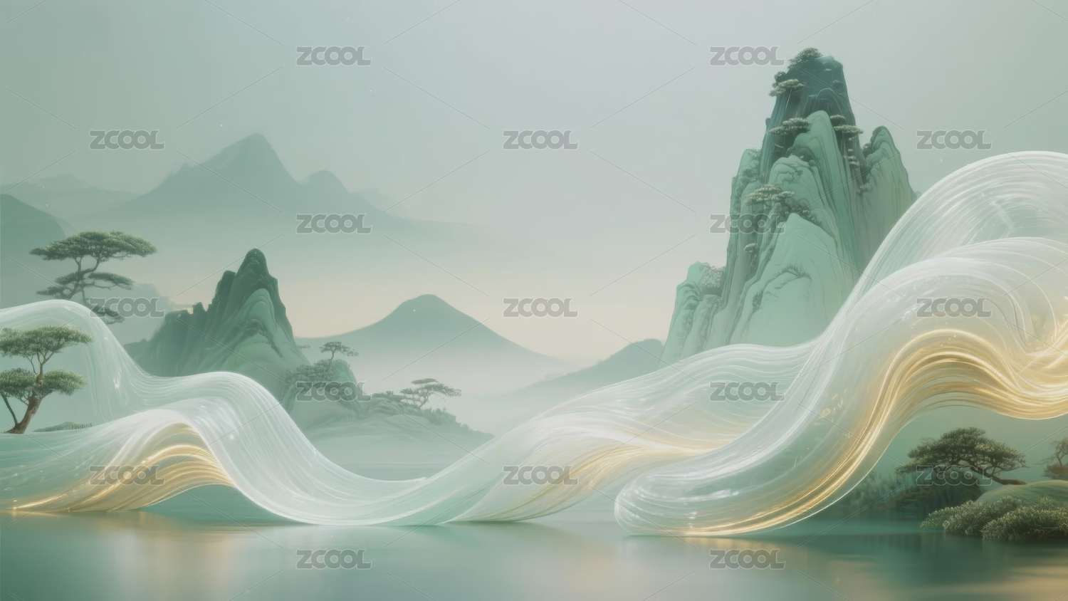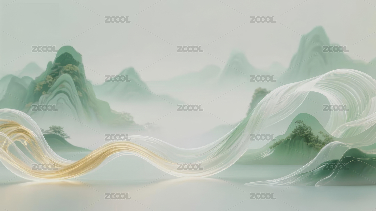 新中式梦幻绿白金色渐变山水画