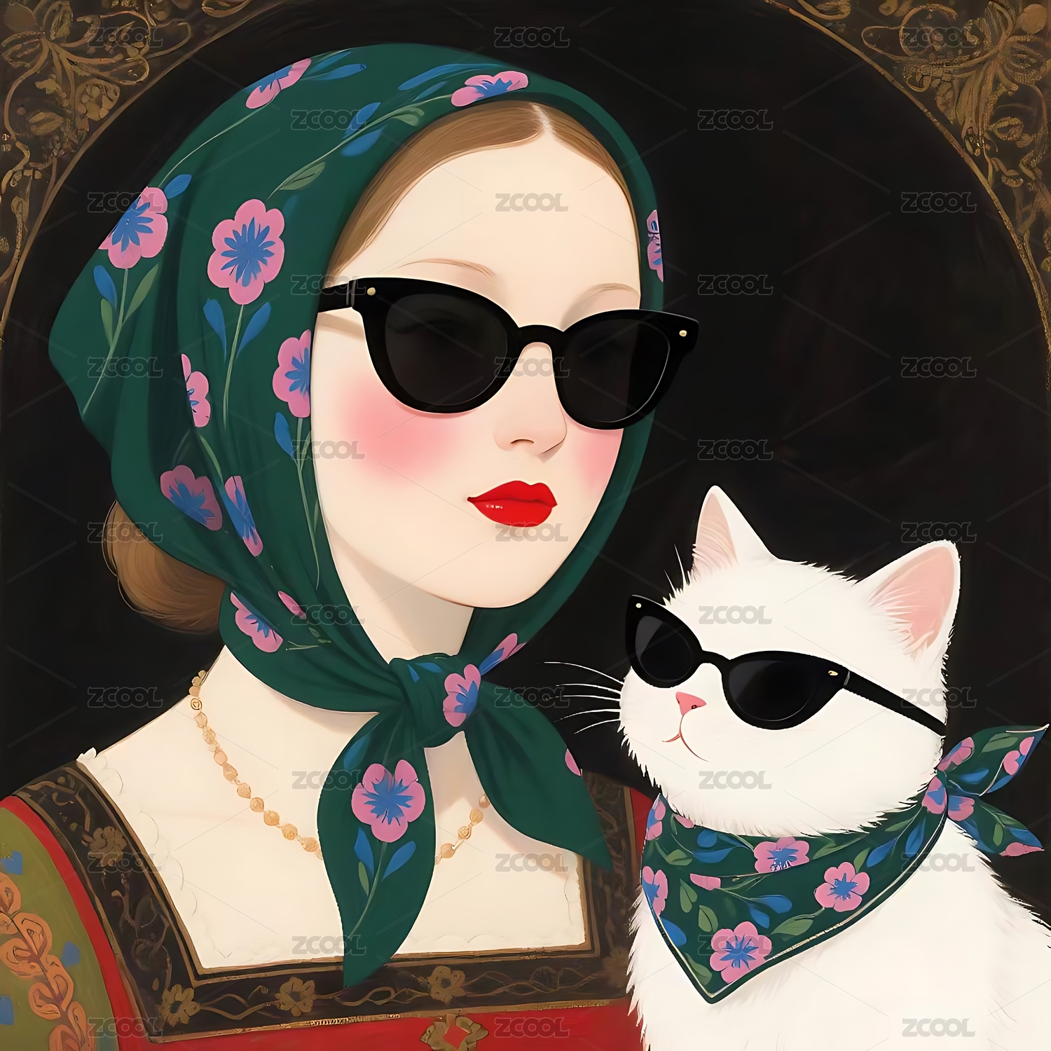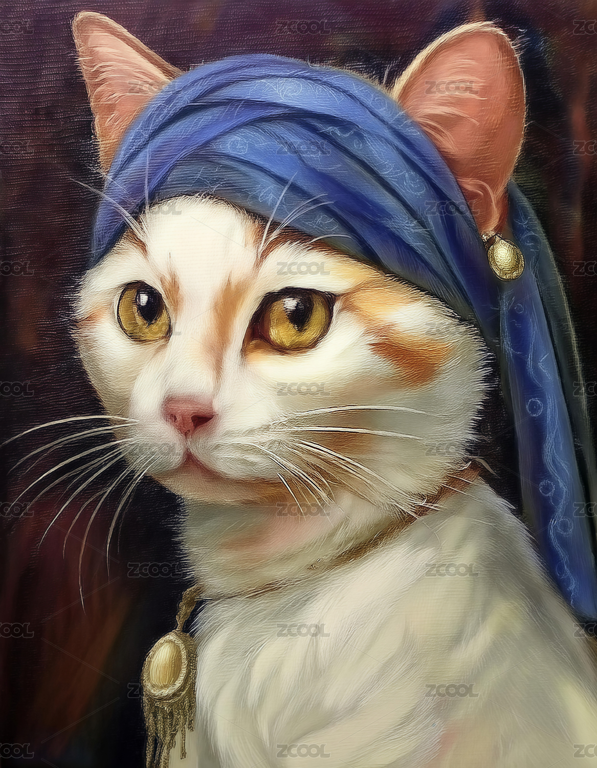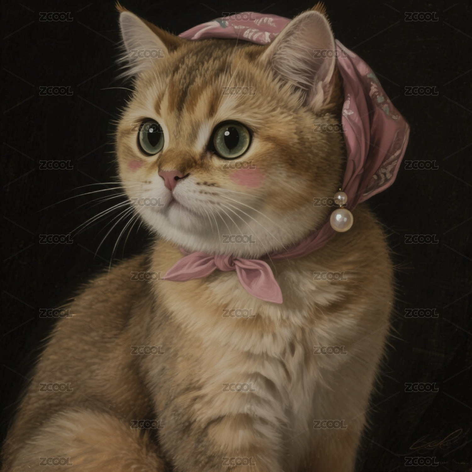 猫,珍珠耳环,头巾,肖像,艺术,复古,优雅,可爱,宠物,猫咪