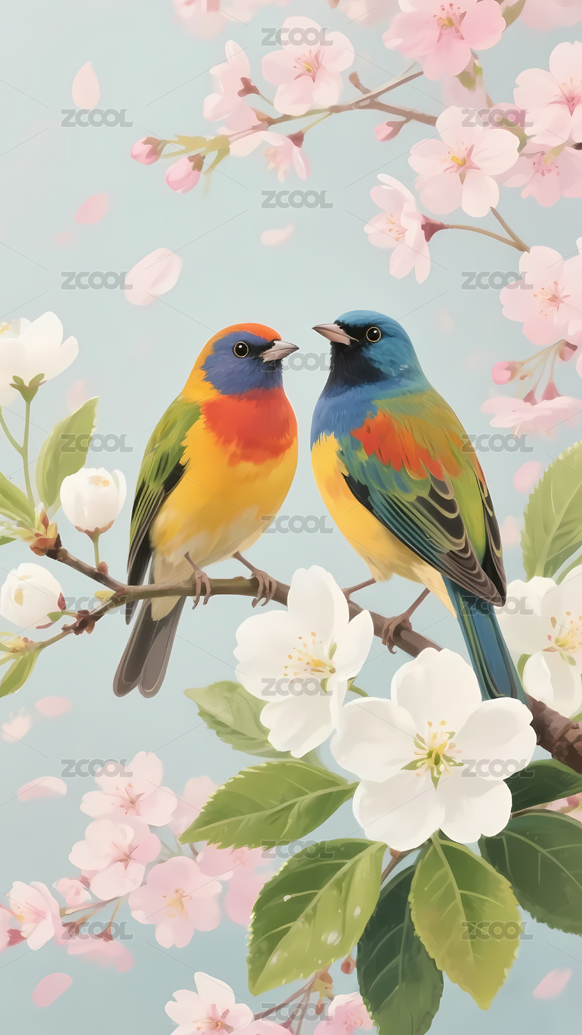 枝头相依的彩色小鸟