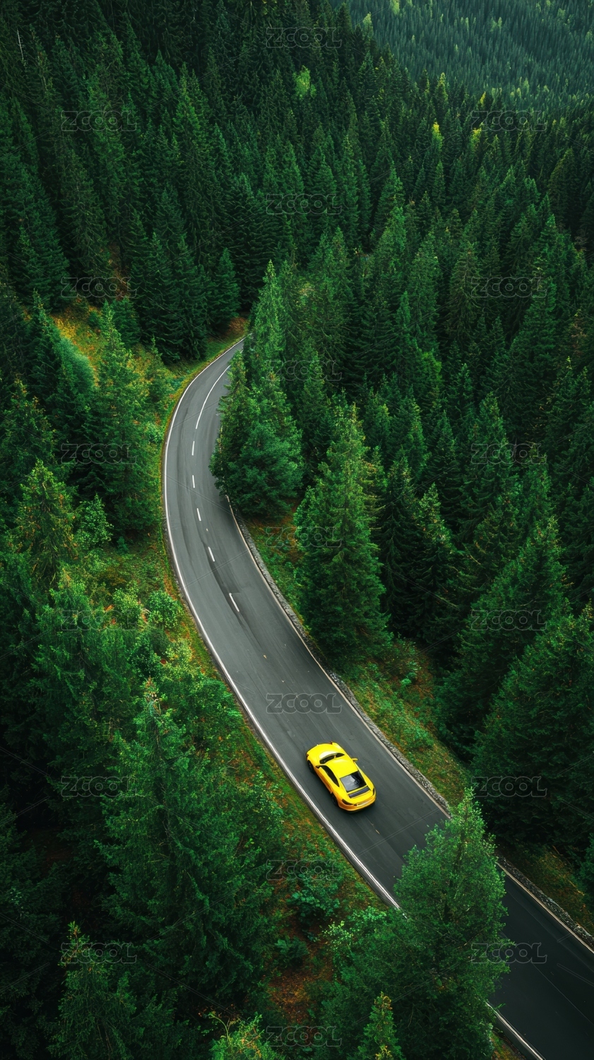 森林中的蜿蜒公路与黄色汽车