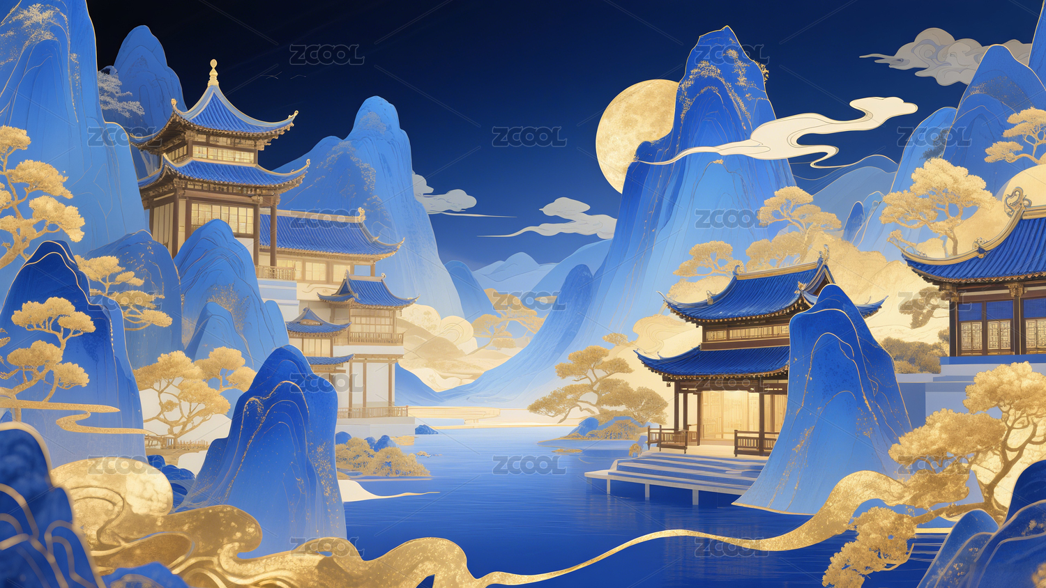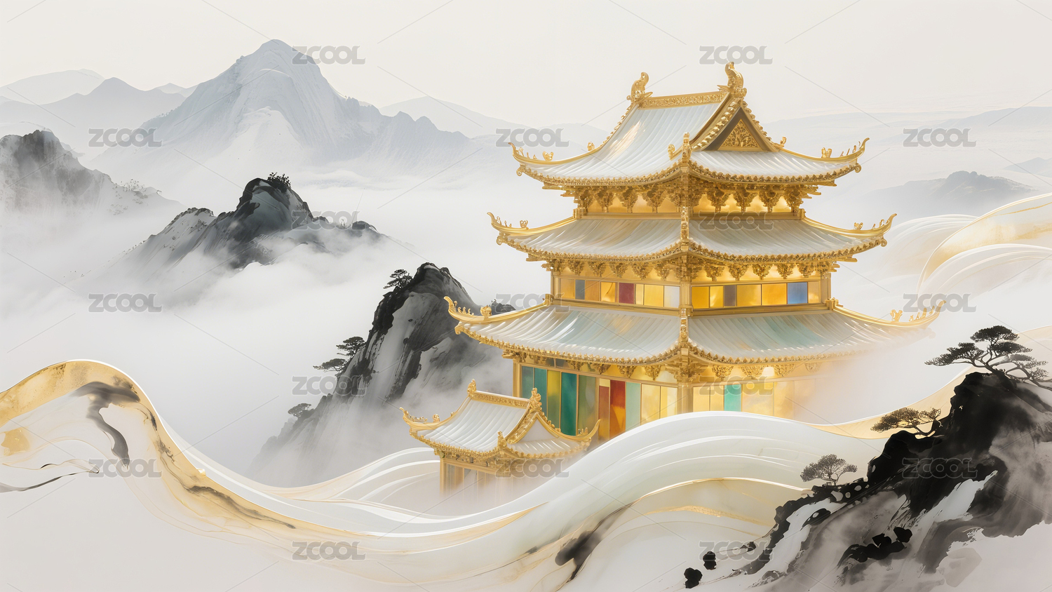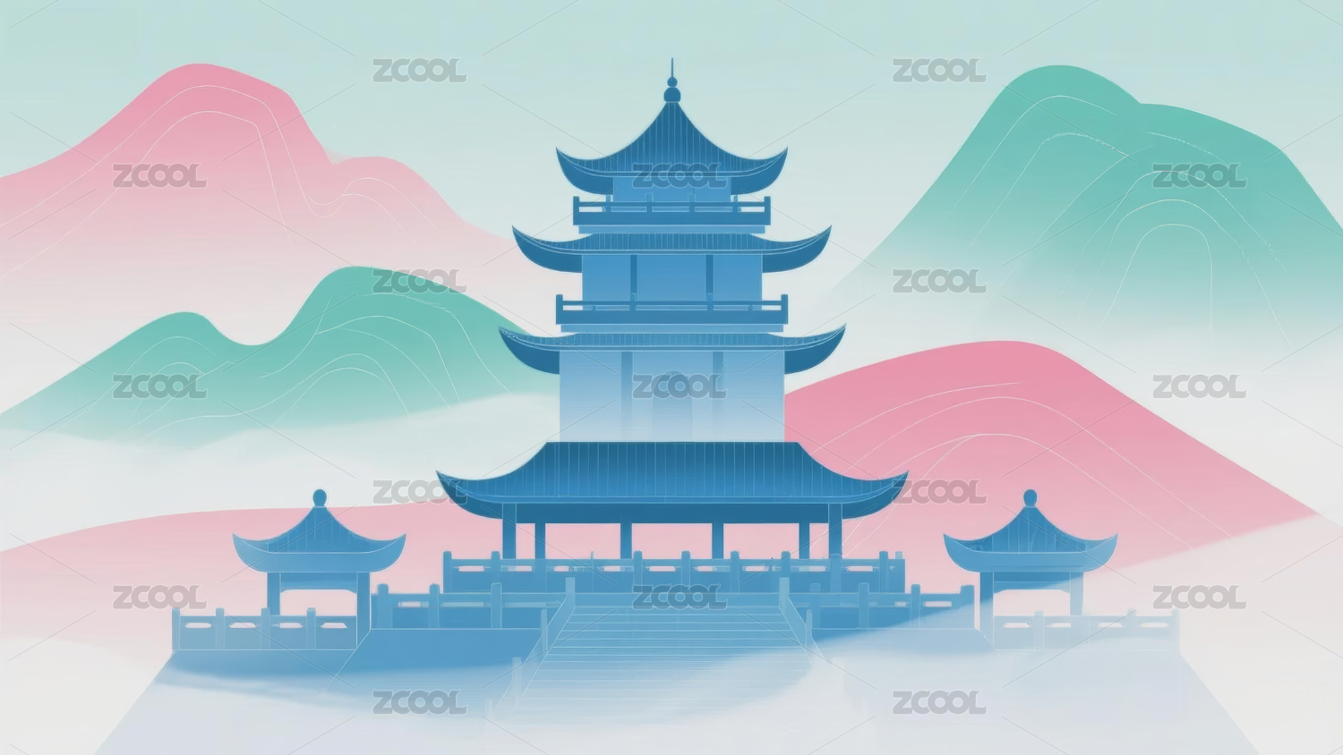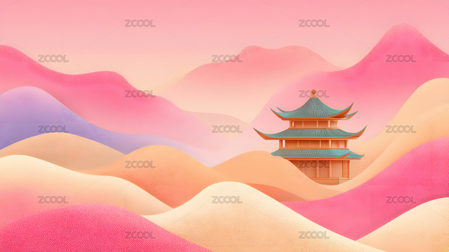 :古建筑 仙境 云雾 山峦 夕阳 粉红色