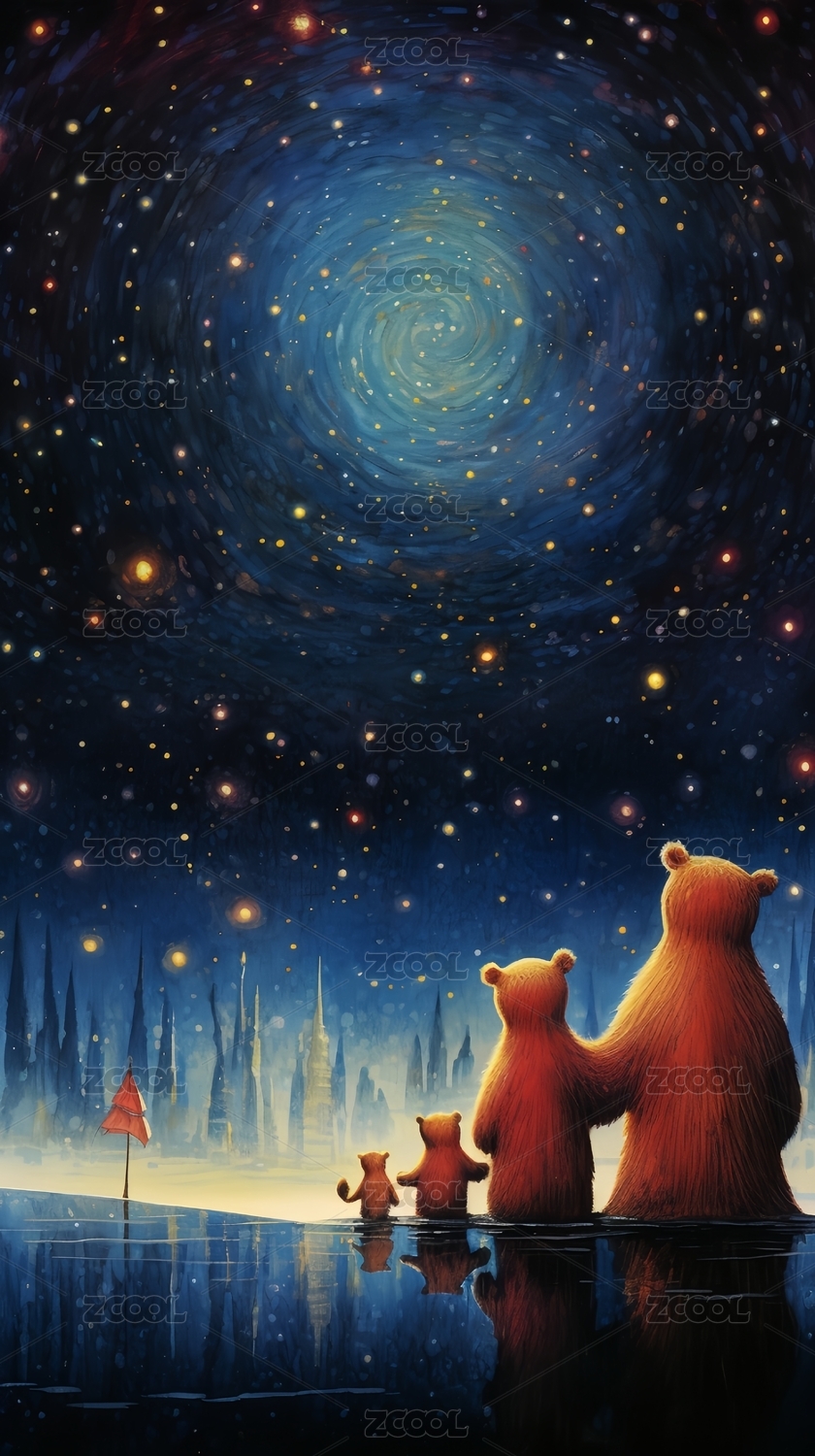 小熊,油灯,夜晚,森林,童话,梦境,花丛,草地,卡通,可爱