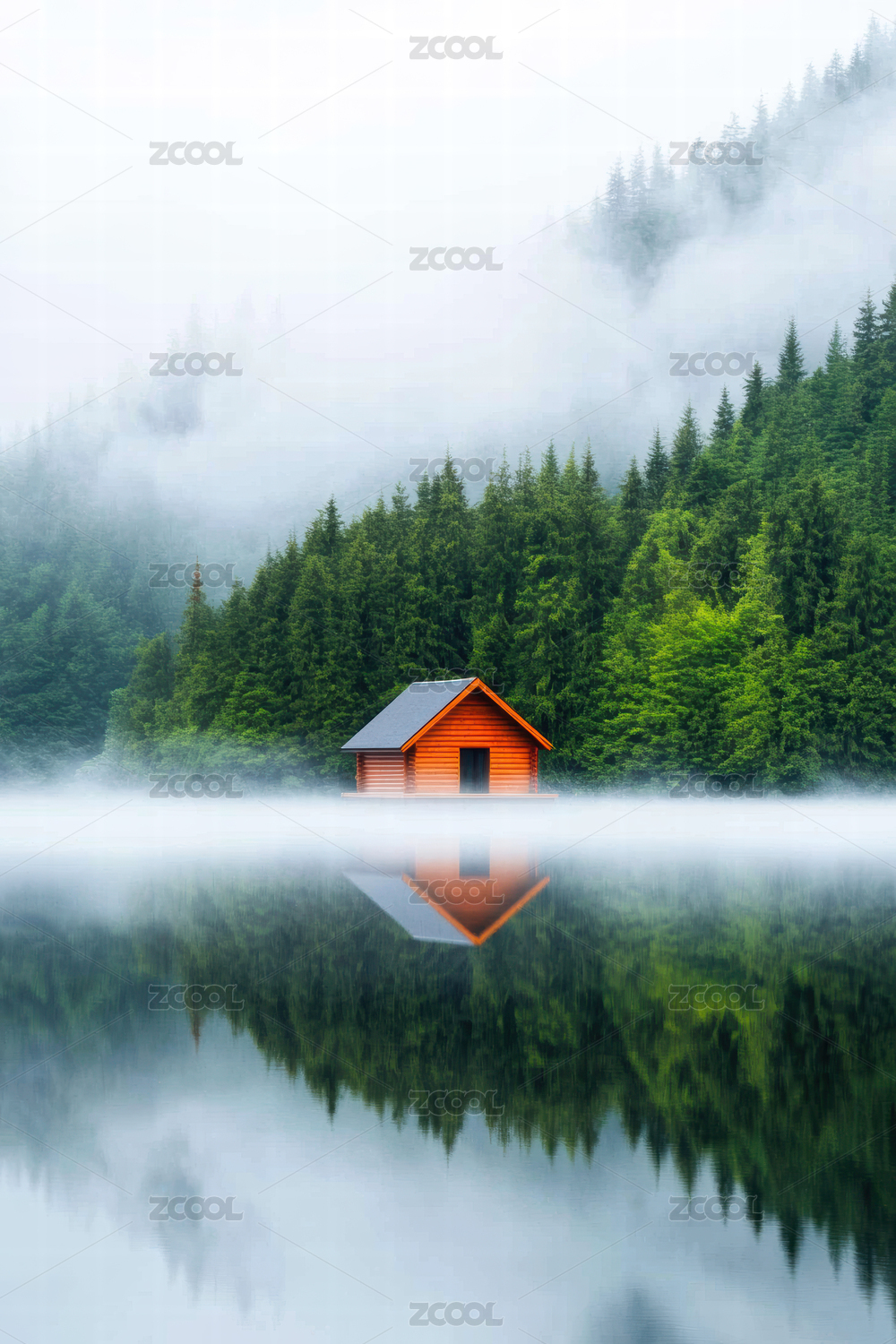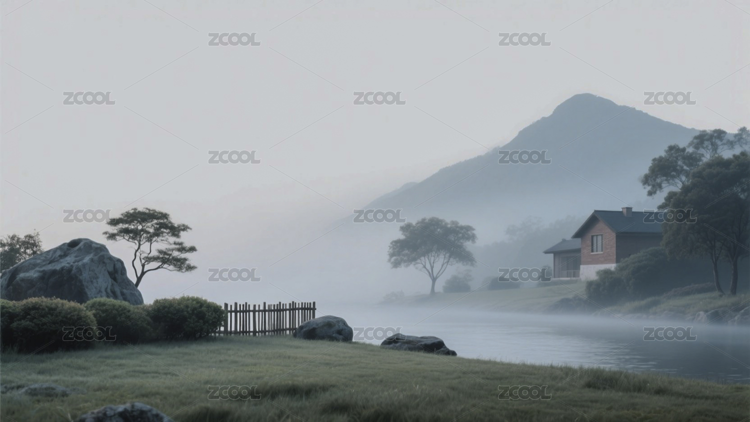雾气,山峰,湖泊,房屋,田园,乡村,宁静,祥和,自然风光,水面