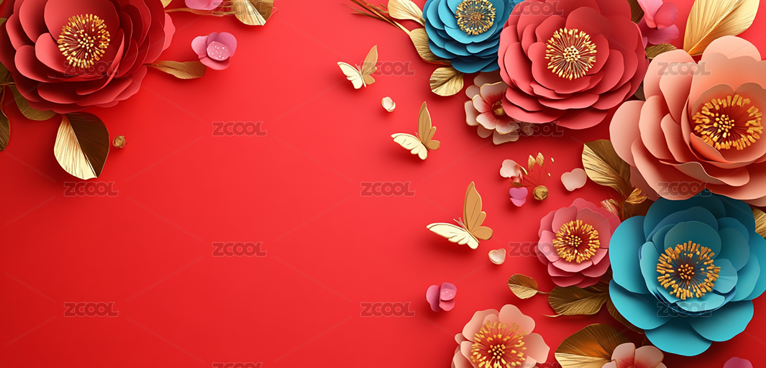 正上方红色背景上的装饰和花朵