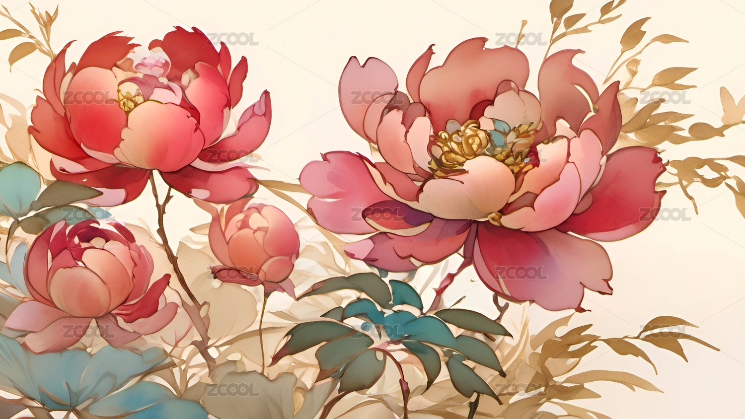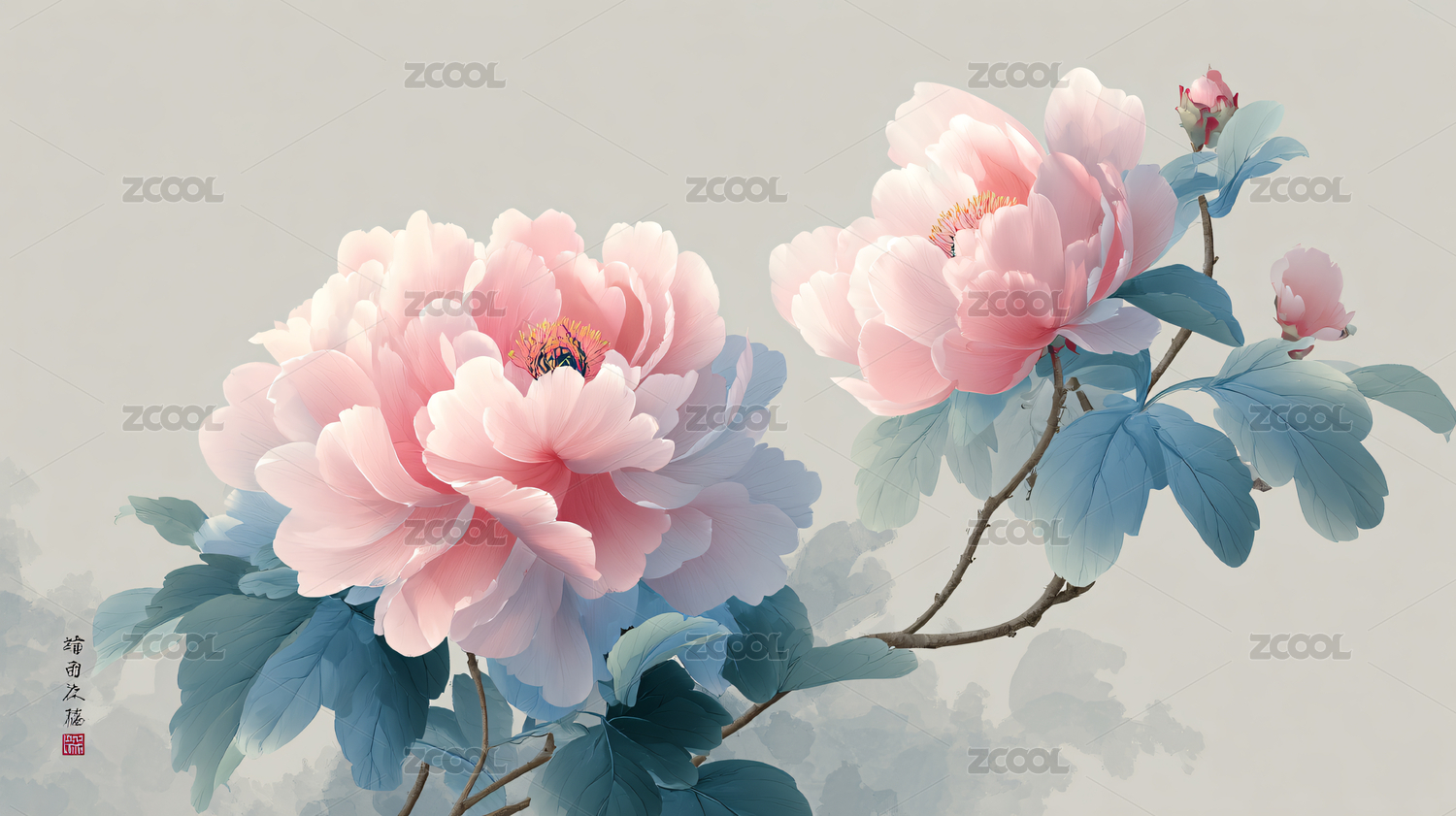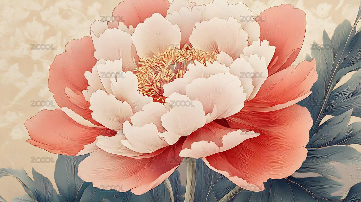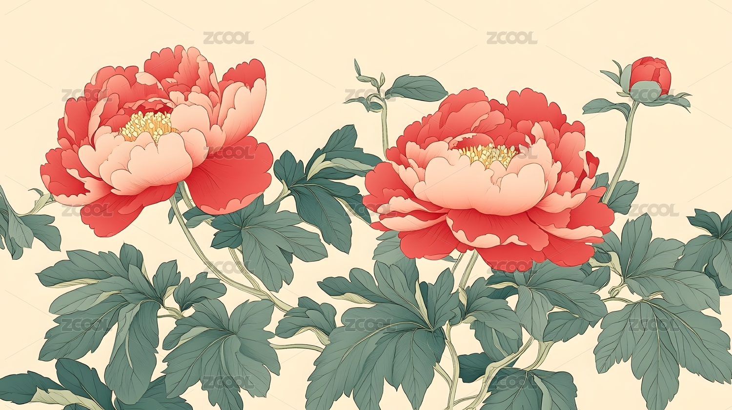 复古工笔风格牡丹花