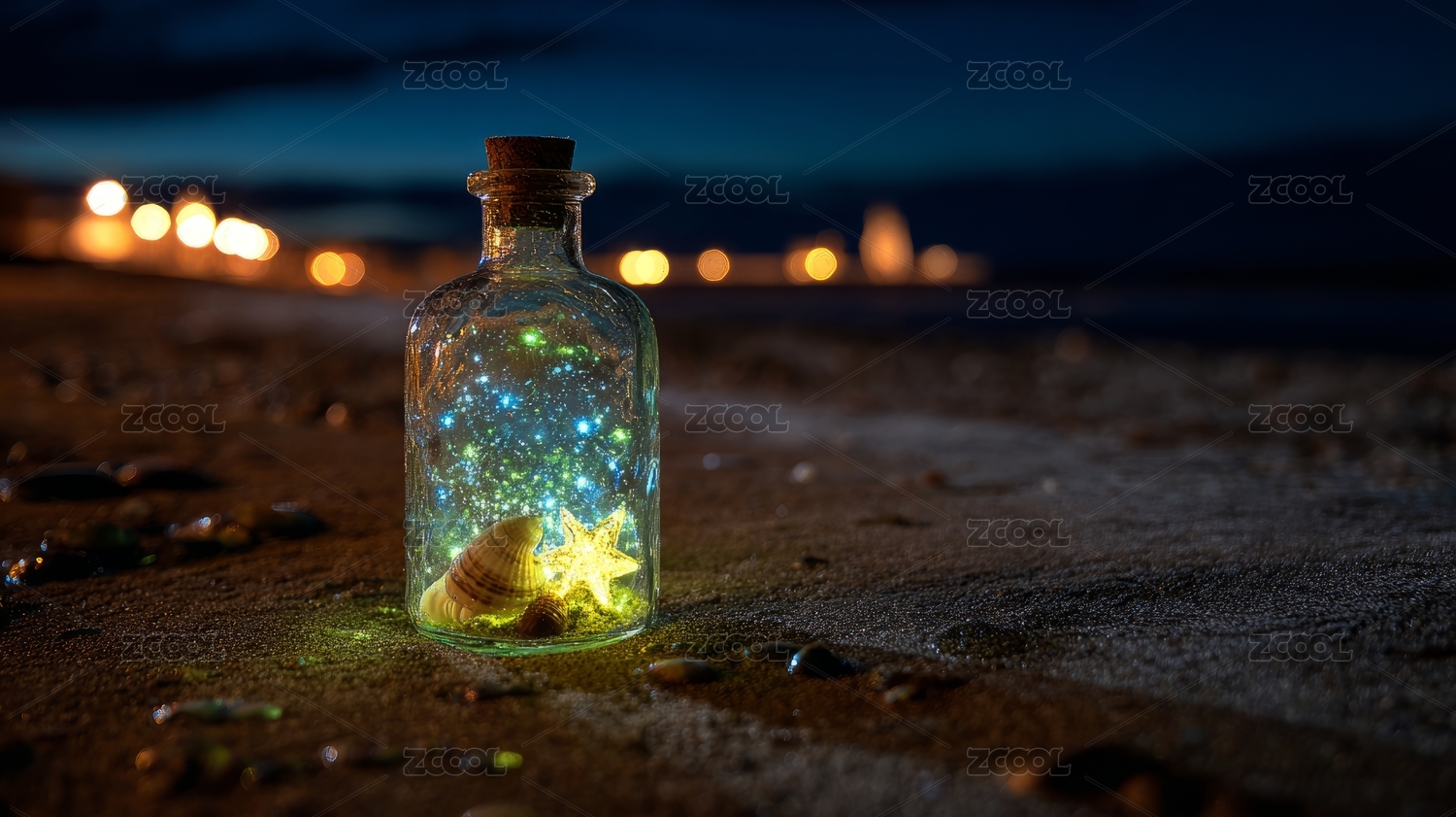 海边沙滩上的漂流瓶闪闪发亮瓶