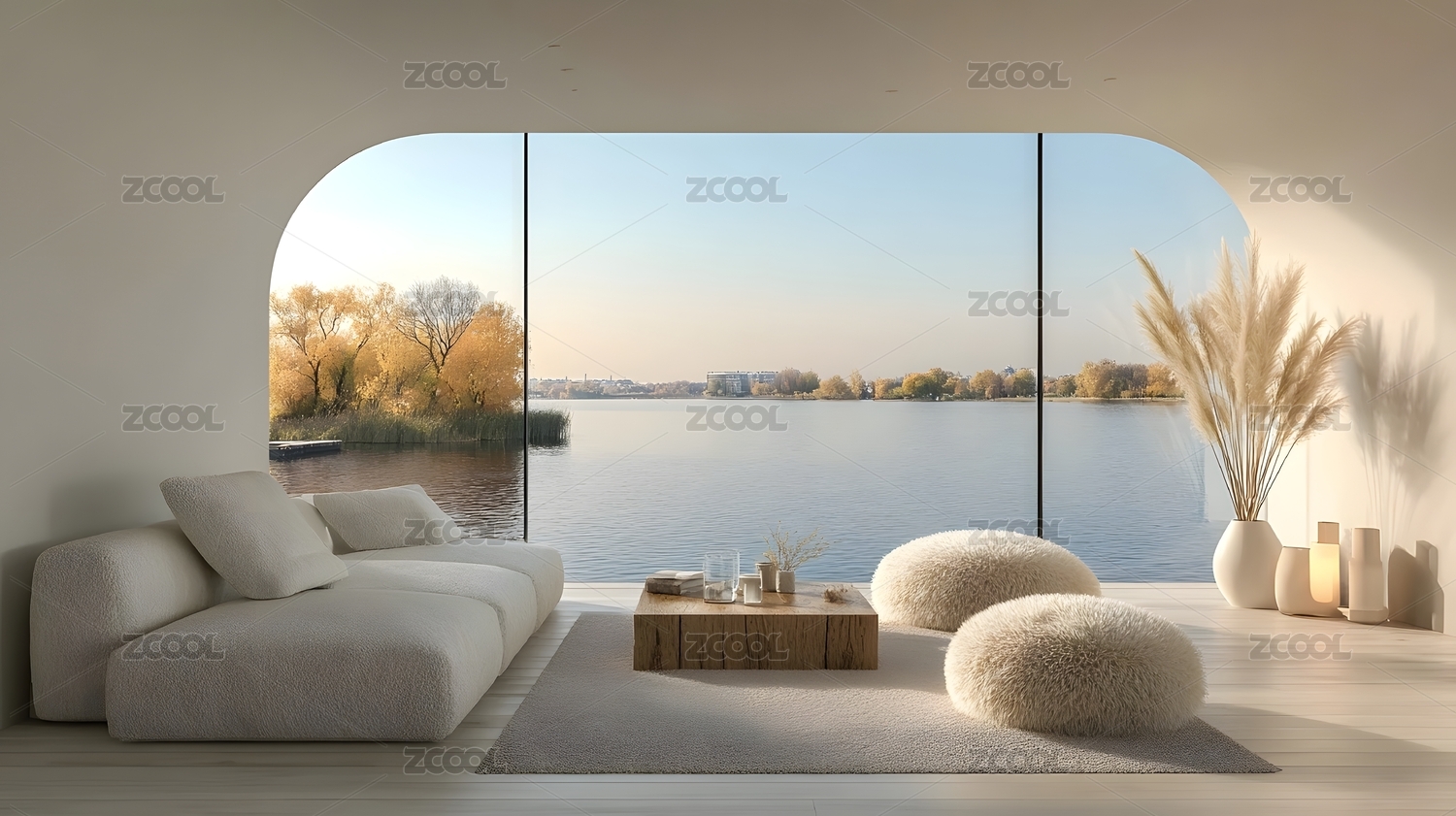 极简客厅湖景