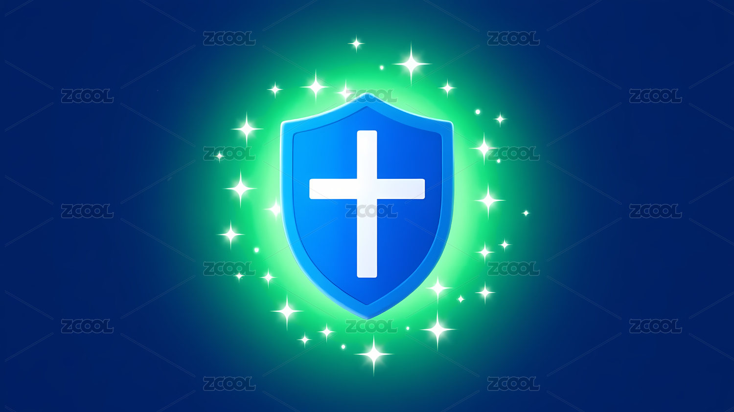 蓝色,深蓝,渐变,环绕,盾牌,十字,光芒,星星,绿色,图案