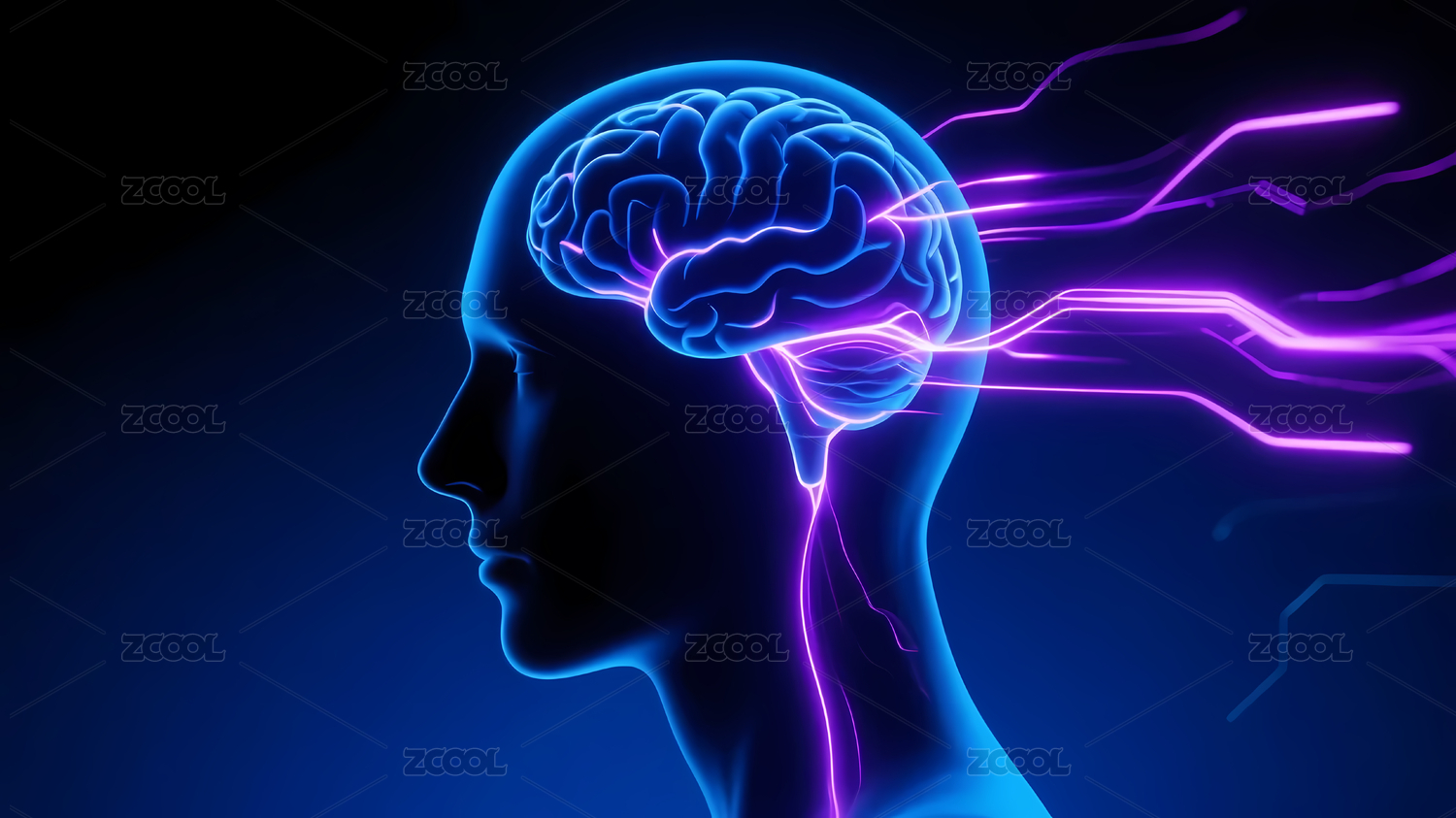深蓝,大脑,流动,紫色,发光,剪影,光带,头部,思维,智慧