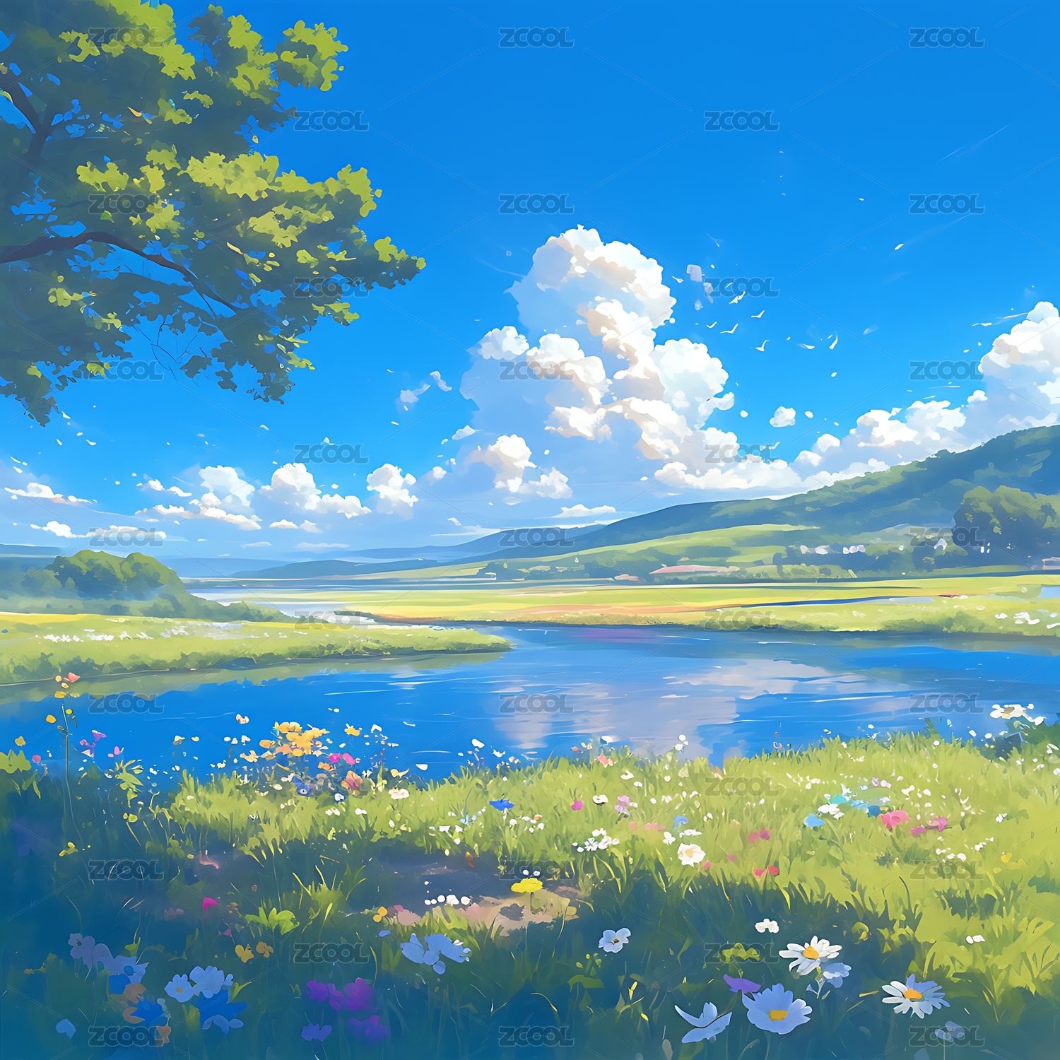 手绘卡通蓝色天空下的森林湖泊风景插画