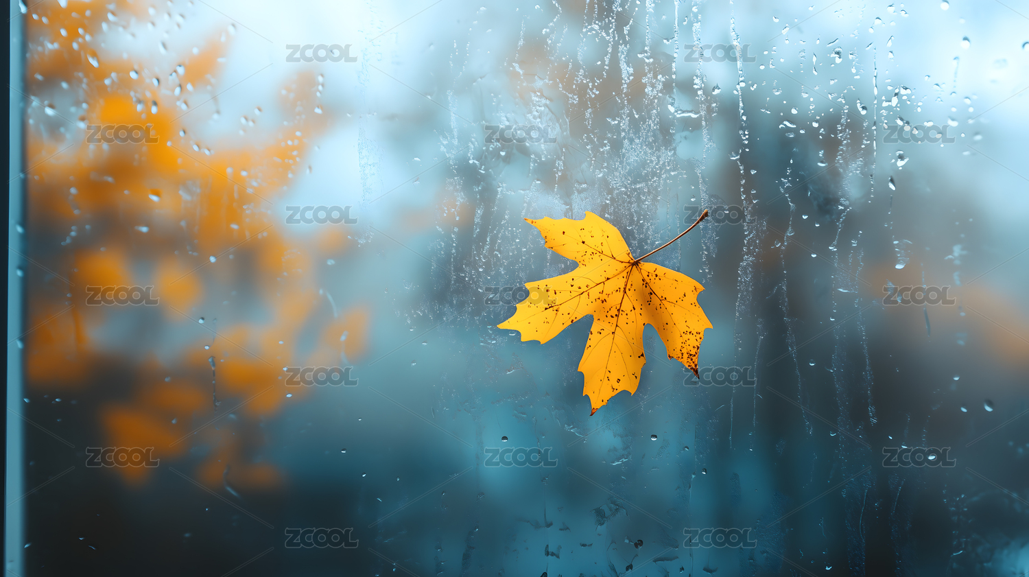 雨中窗景与飘落秋叶