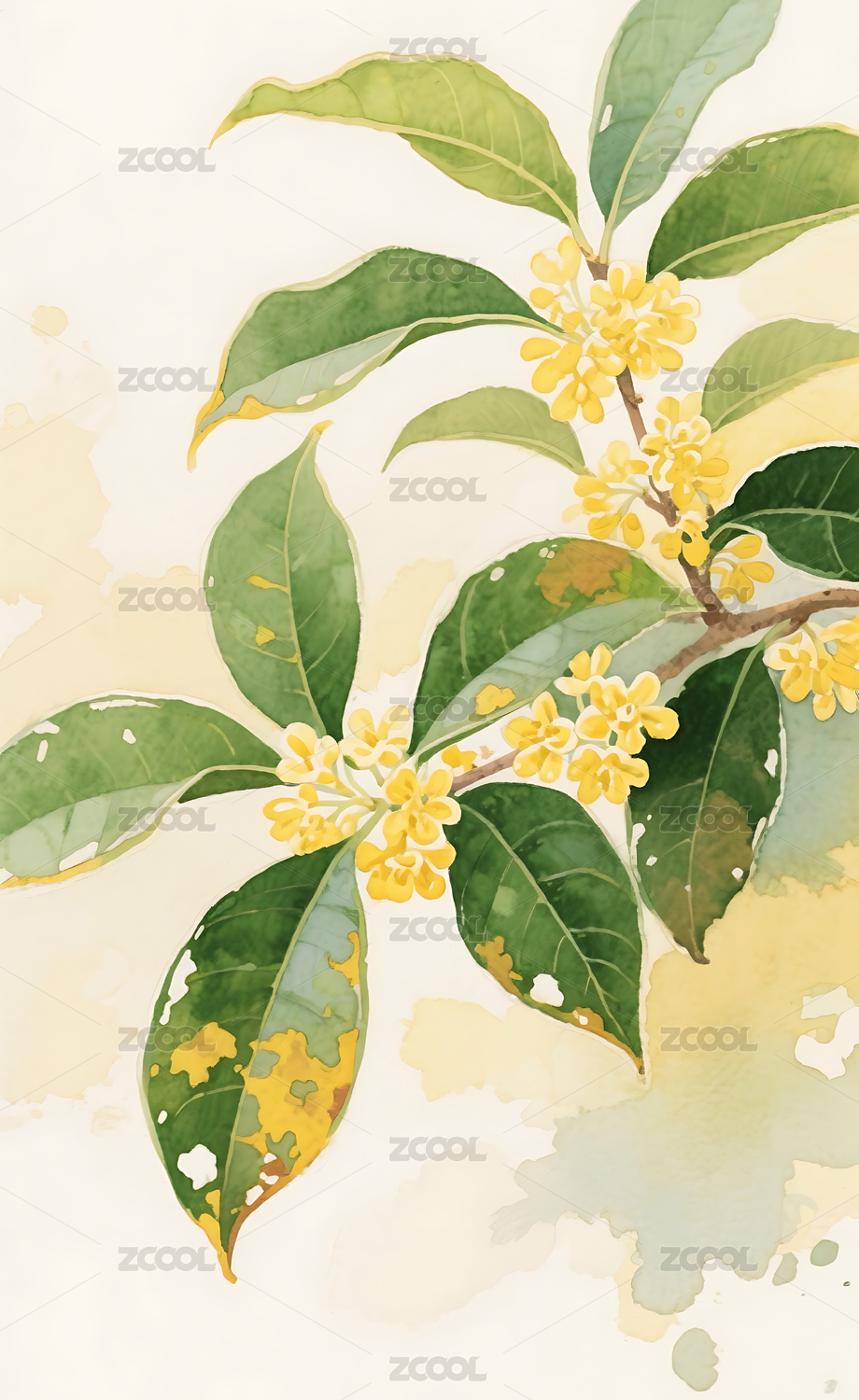 桂花,水彩,绘画,花卉,枝叶,黄花,绿叶,淡雅,清新,水墨