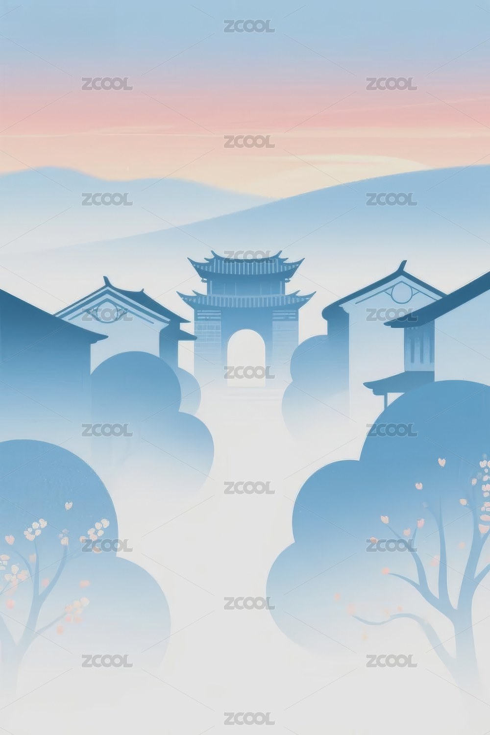 山水古建筑晨景