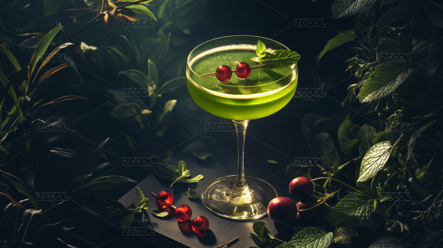 绿底白纹台面上装带薄荷叶饮品的高脚杯
