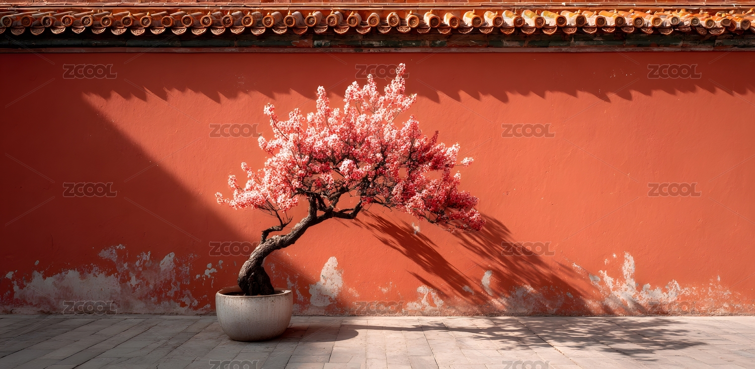 粉色樱花盆栽映衬朱红色墙面