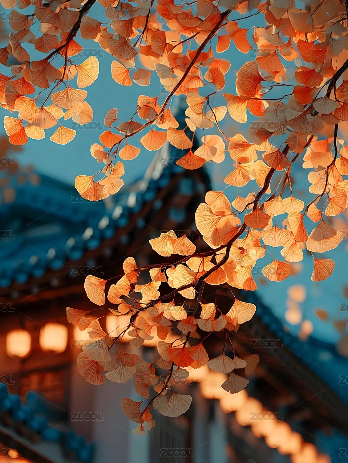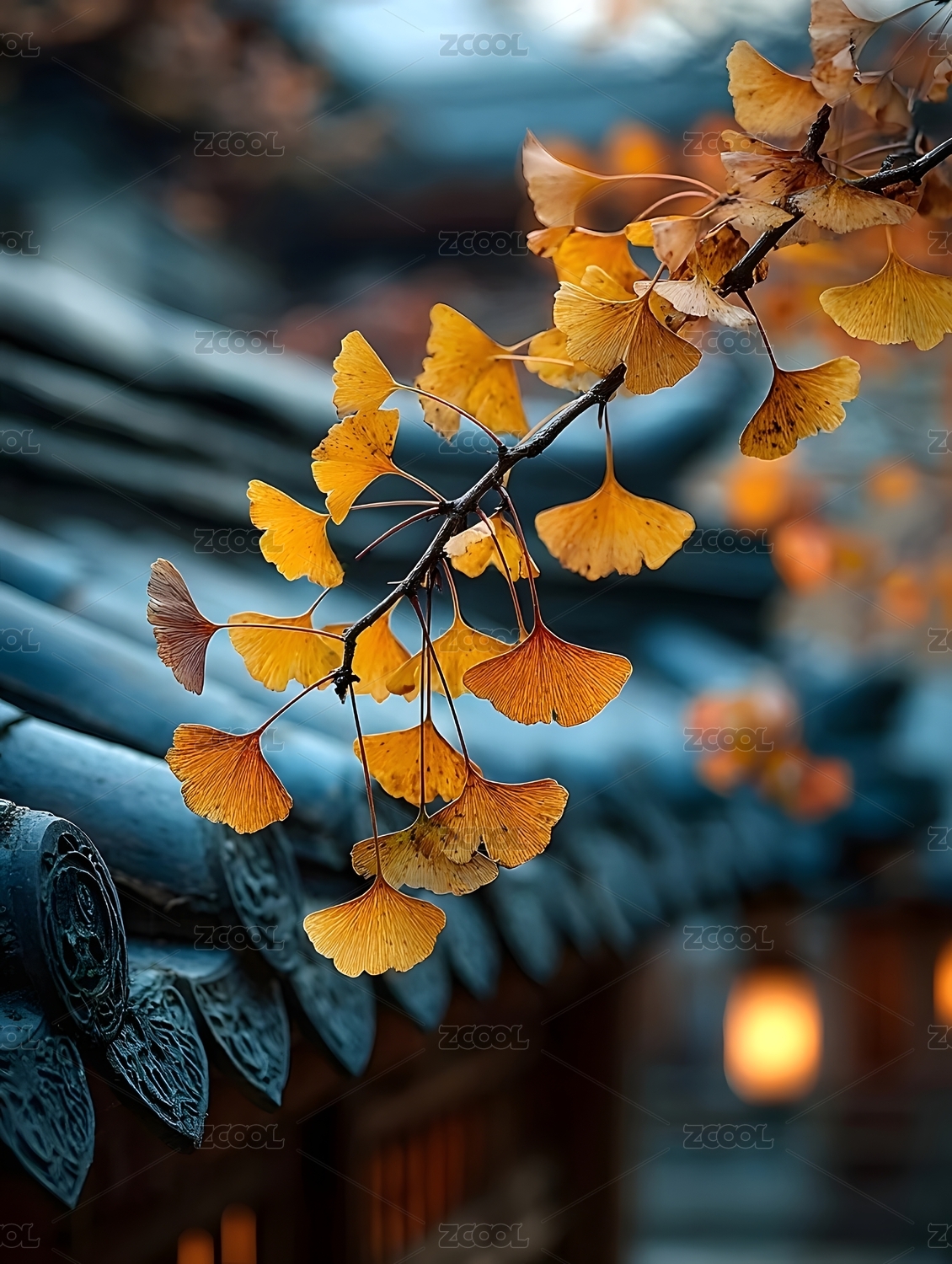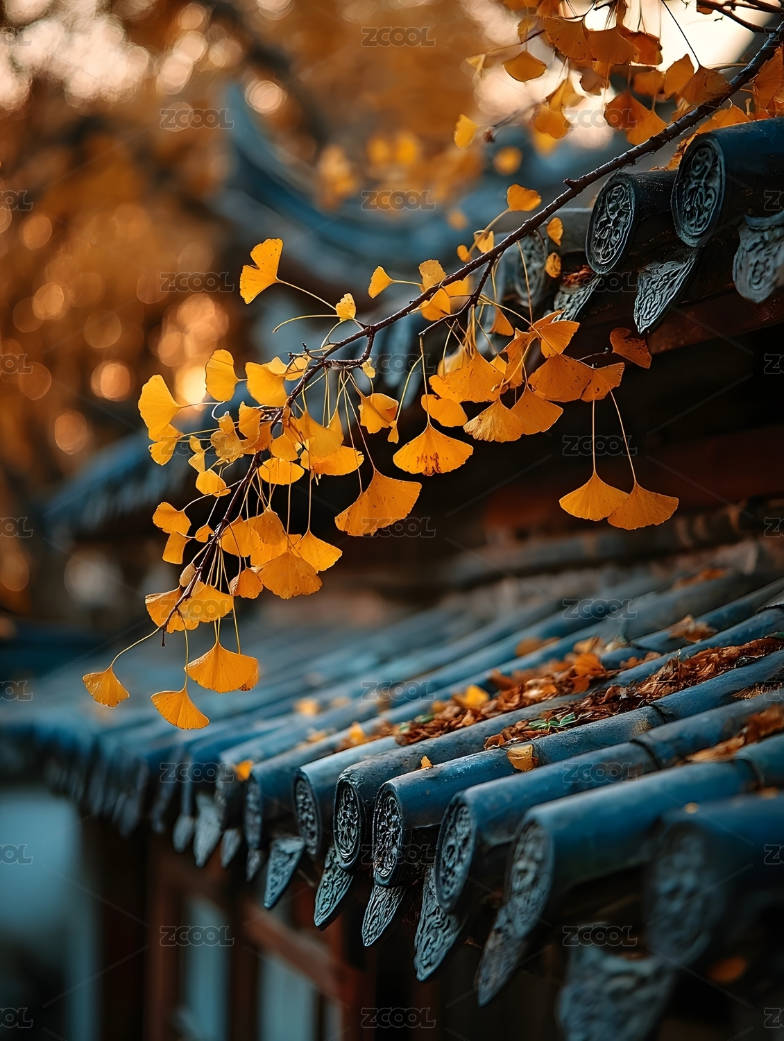 银杏叶与古建筑屋顶