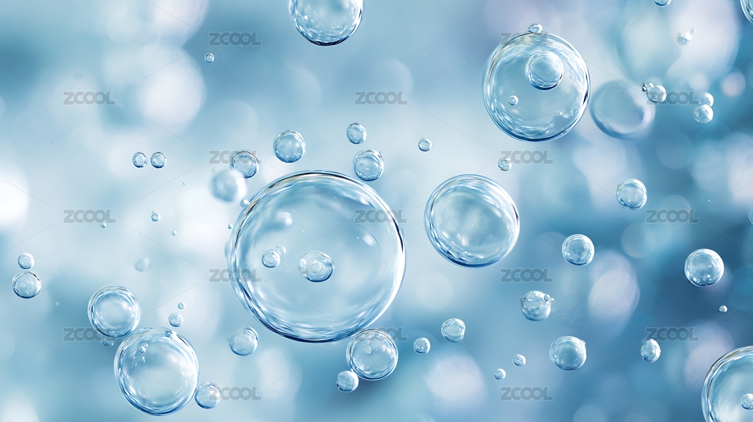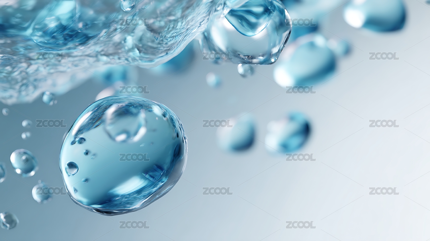 晶莹水珠悬浮于淡蓝背景的梦幻场景