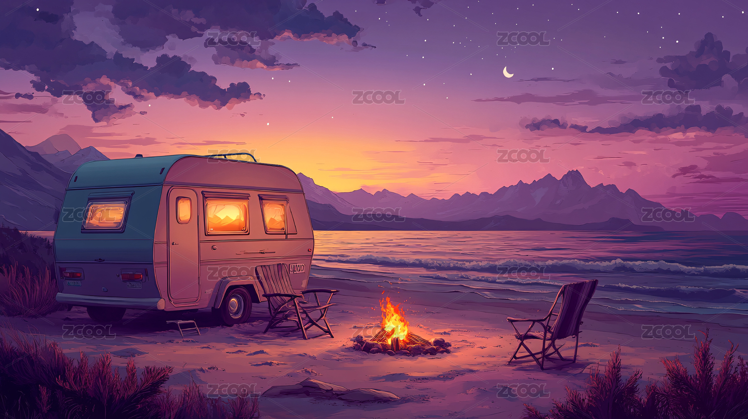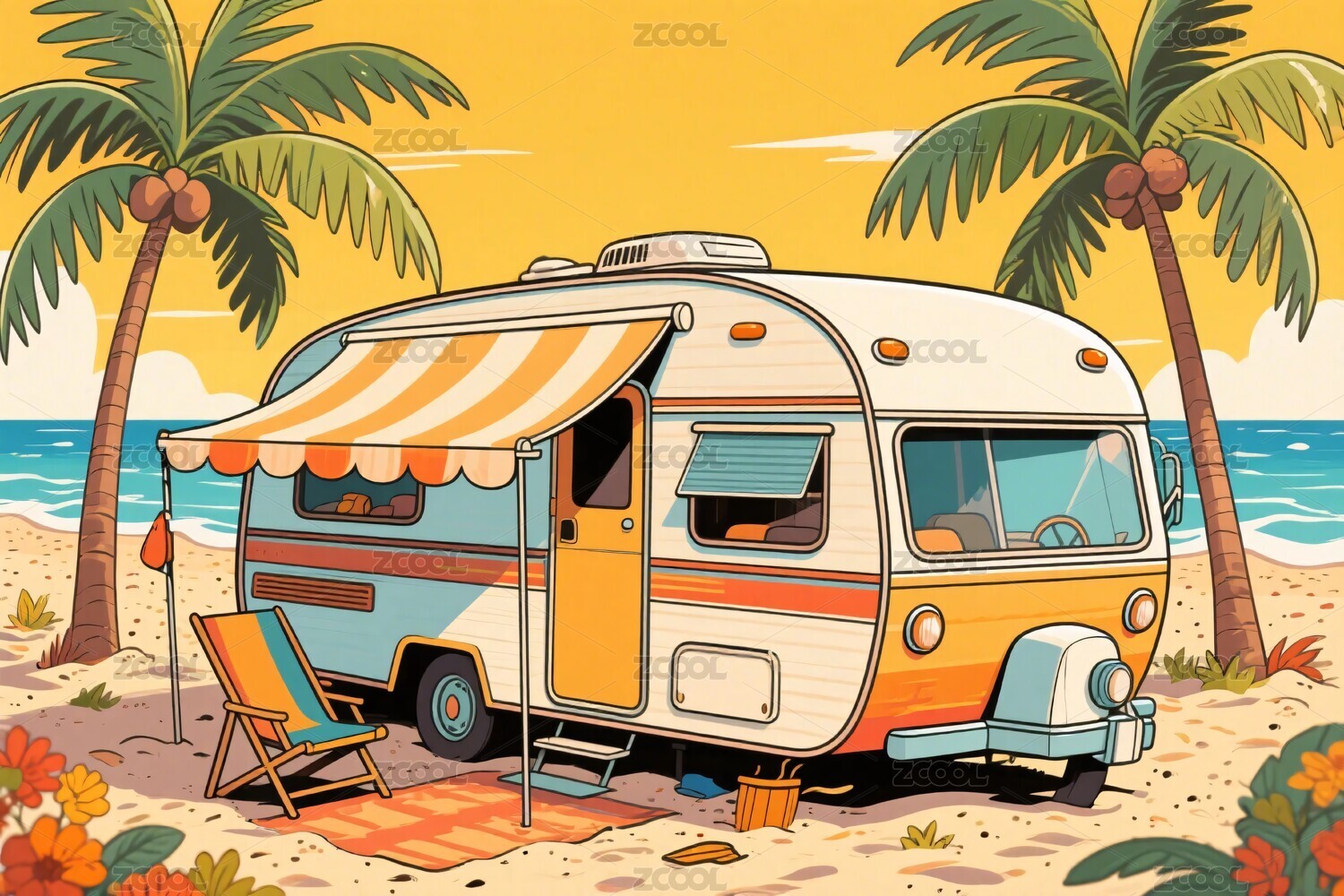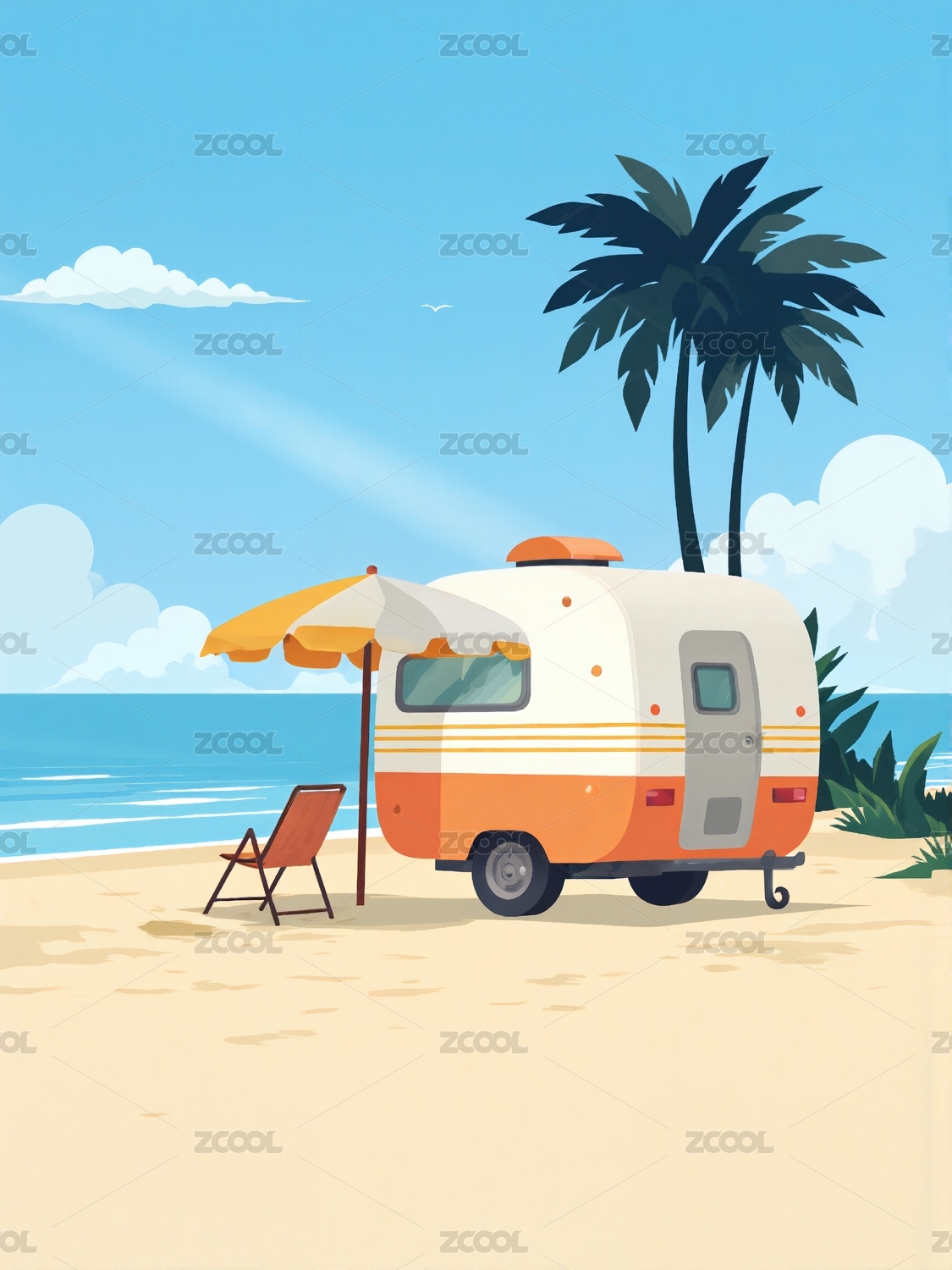 卡通房车悠闲感海滩场景