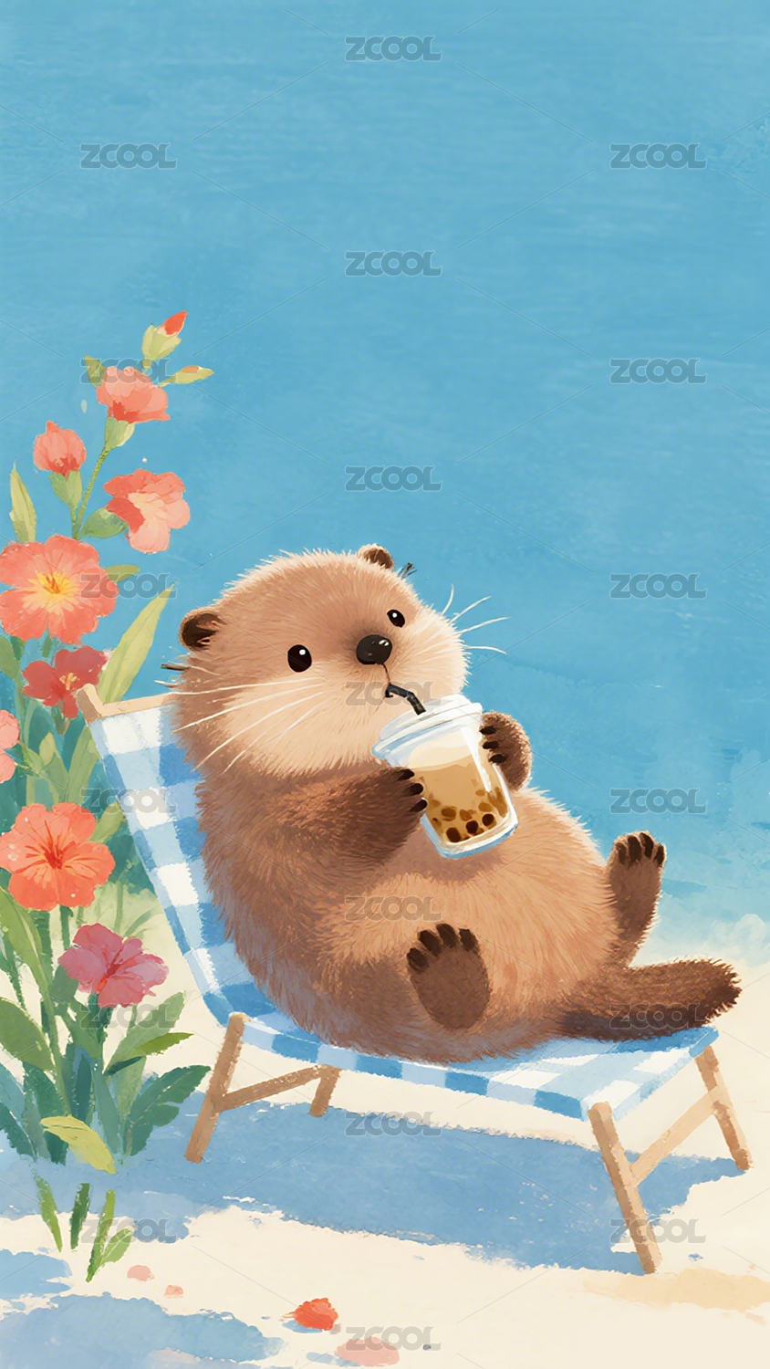 卡通海滩上的呆萌猫鼬头像潮流插画图案