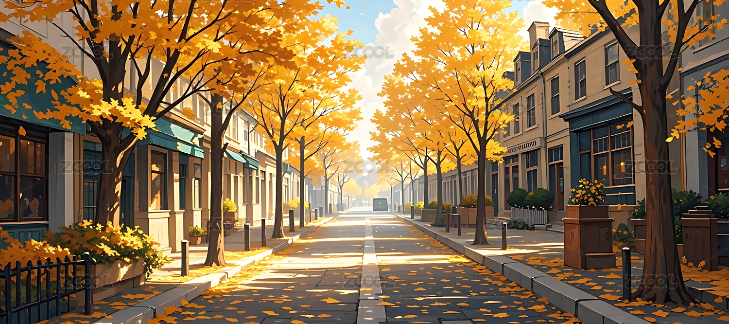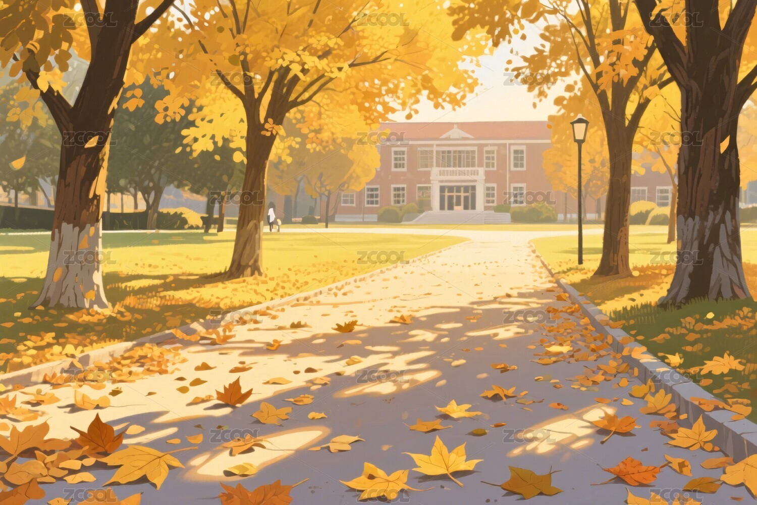 秋天的公园小道,金黄色的树叶,安静的长椅
