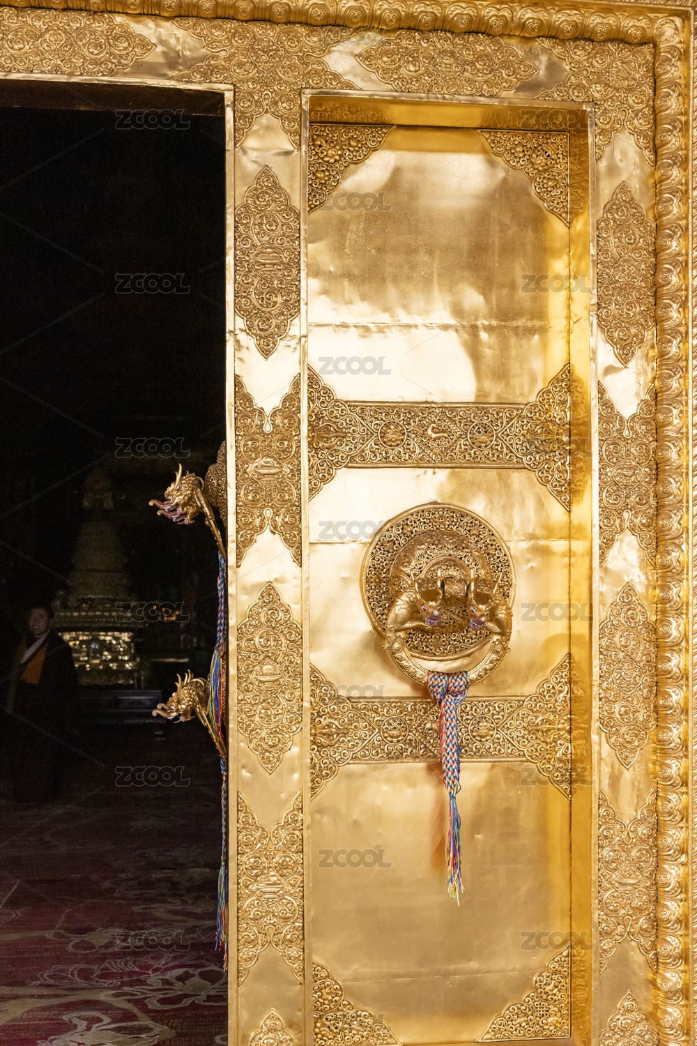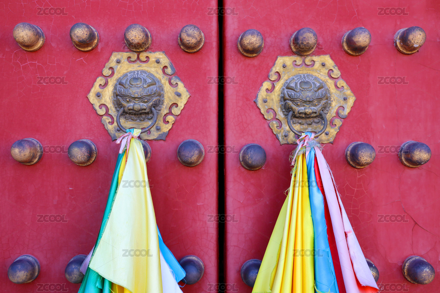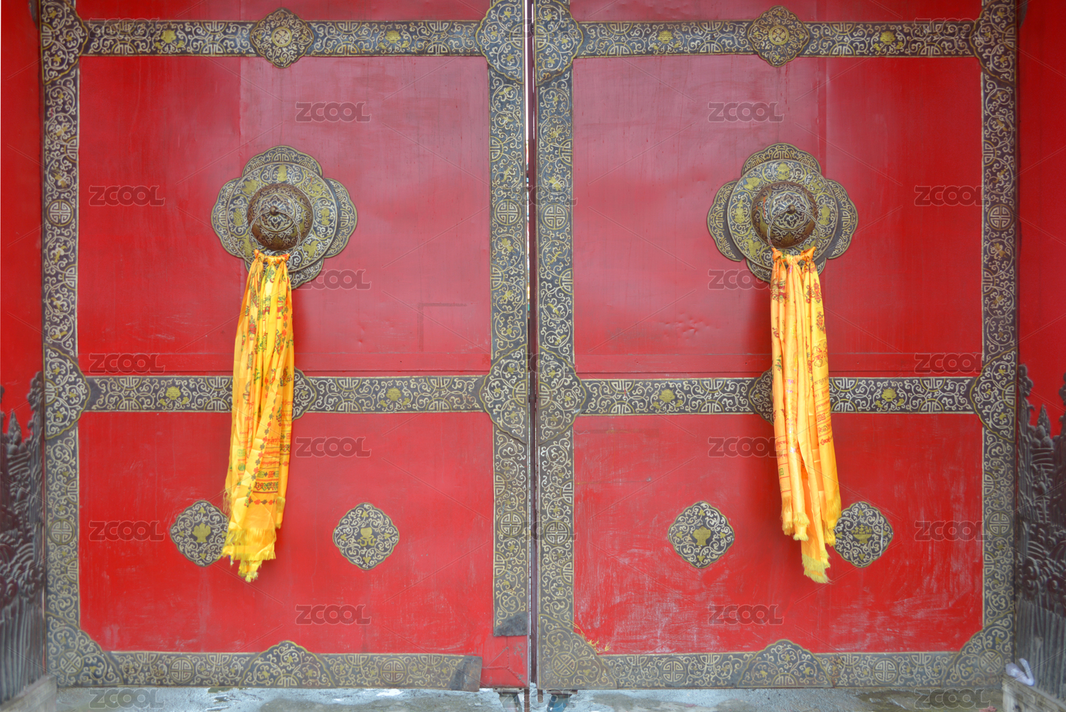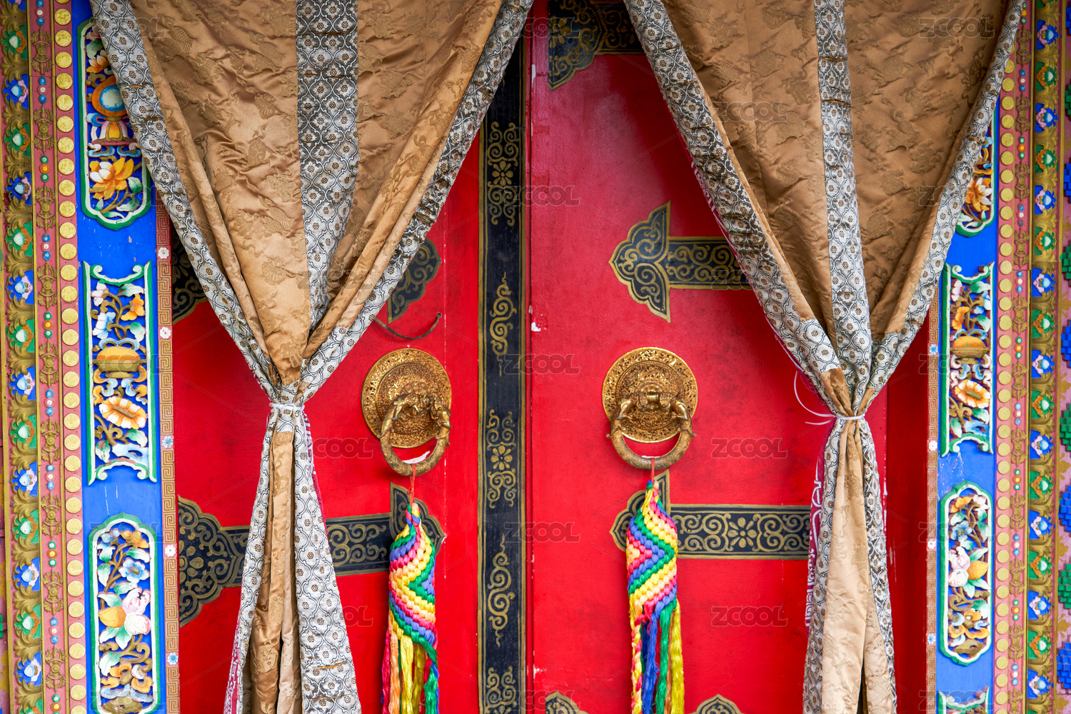 西藏的藏传佛教寺院的大门和彩色装饰物