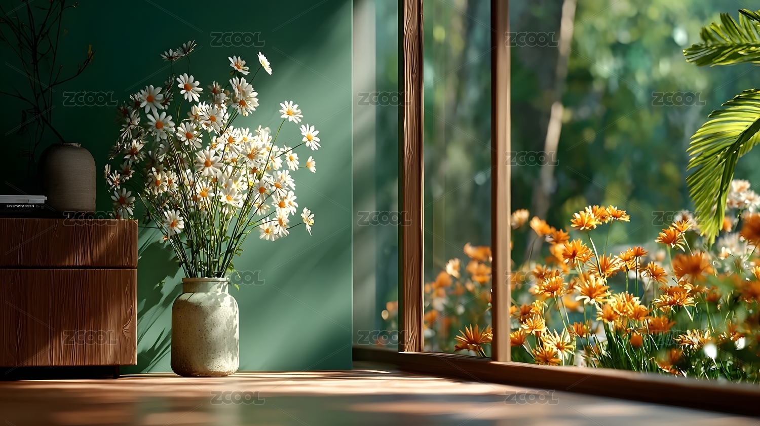 室内花瓶与窗外花园