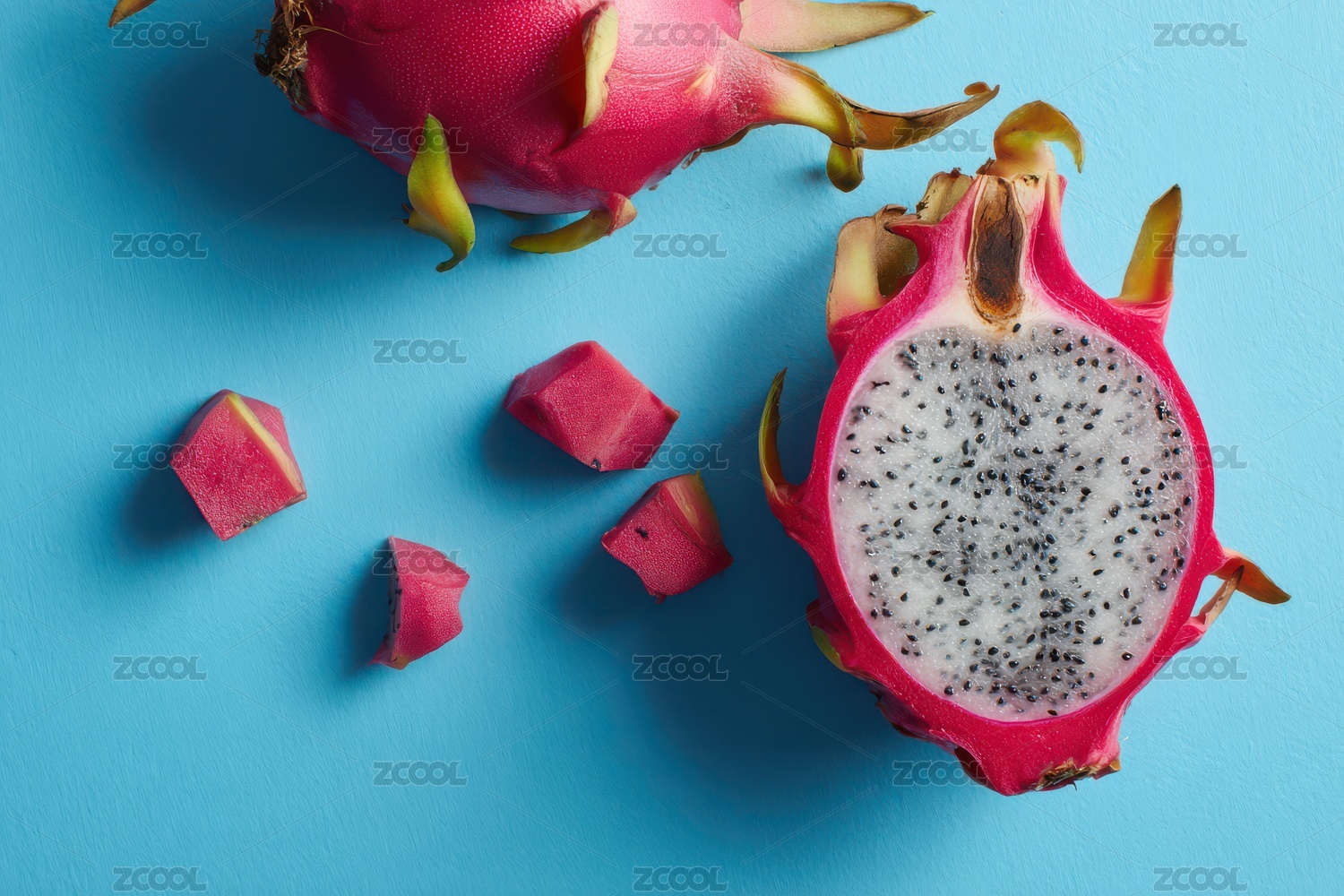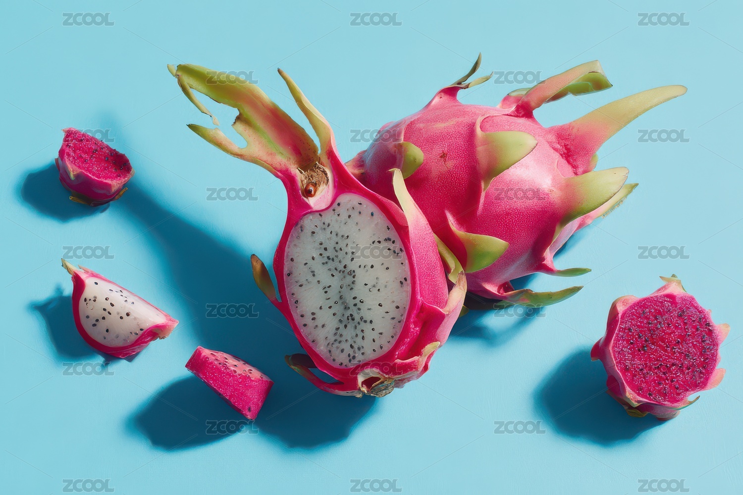 龙果切片与整体展示在蓝色背景上
