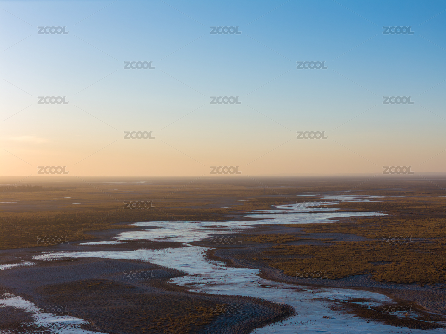 甘肃省酒泉市鸣沙山月牙泉夕阳下的蜿蜒河流