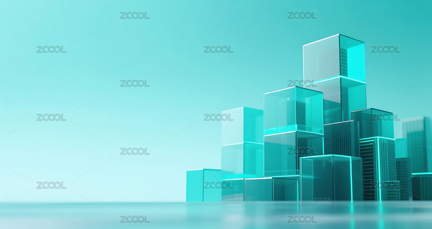 蓝绿色科技几何方块玻璃质感城市建筑