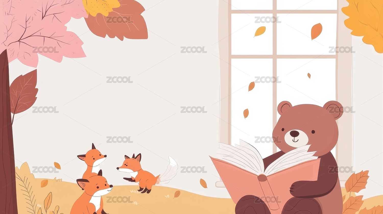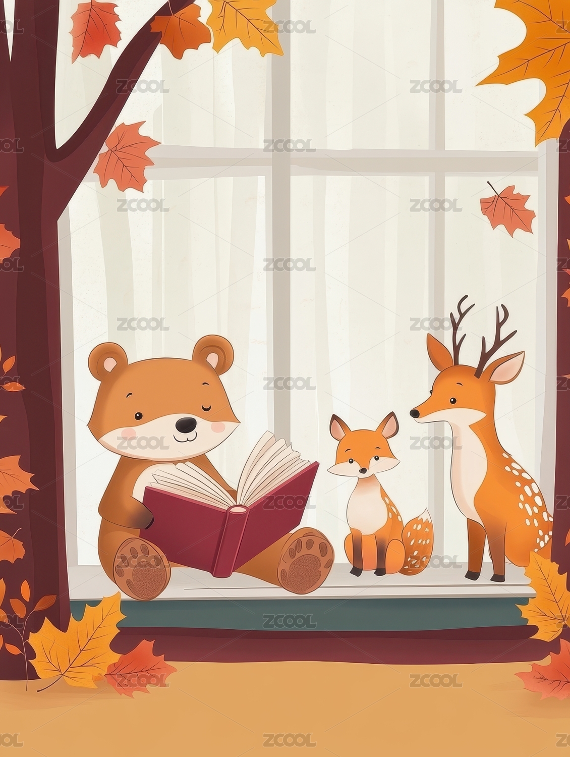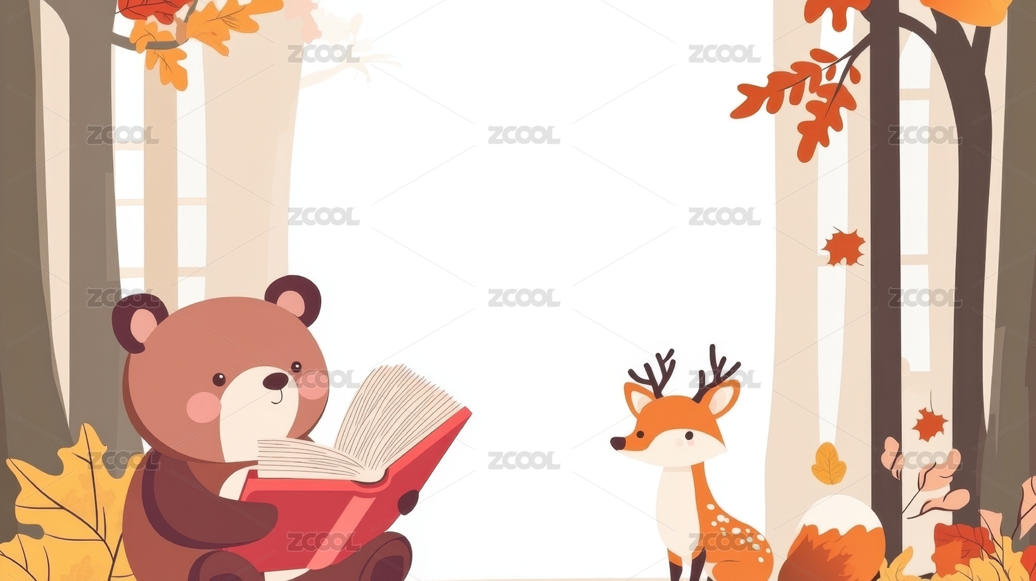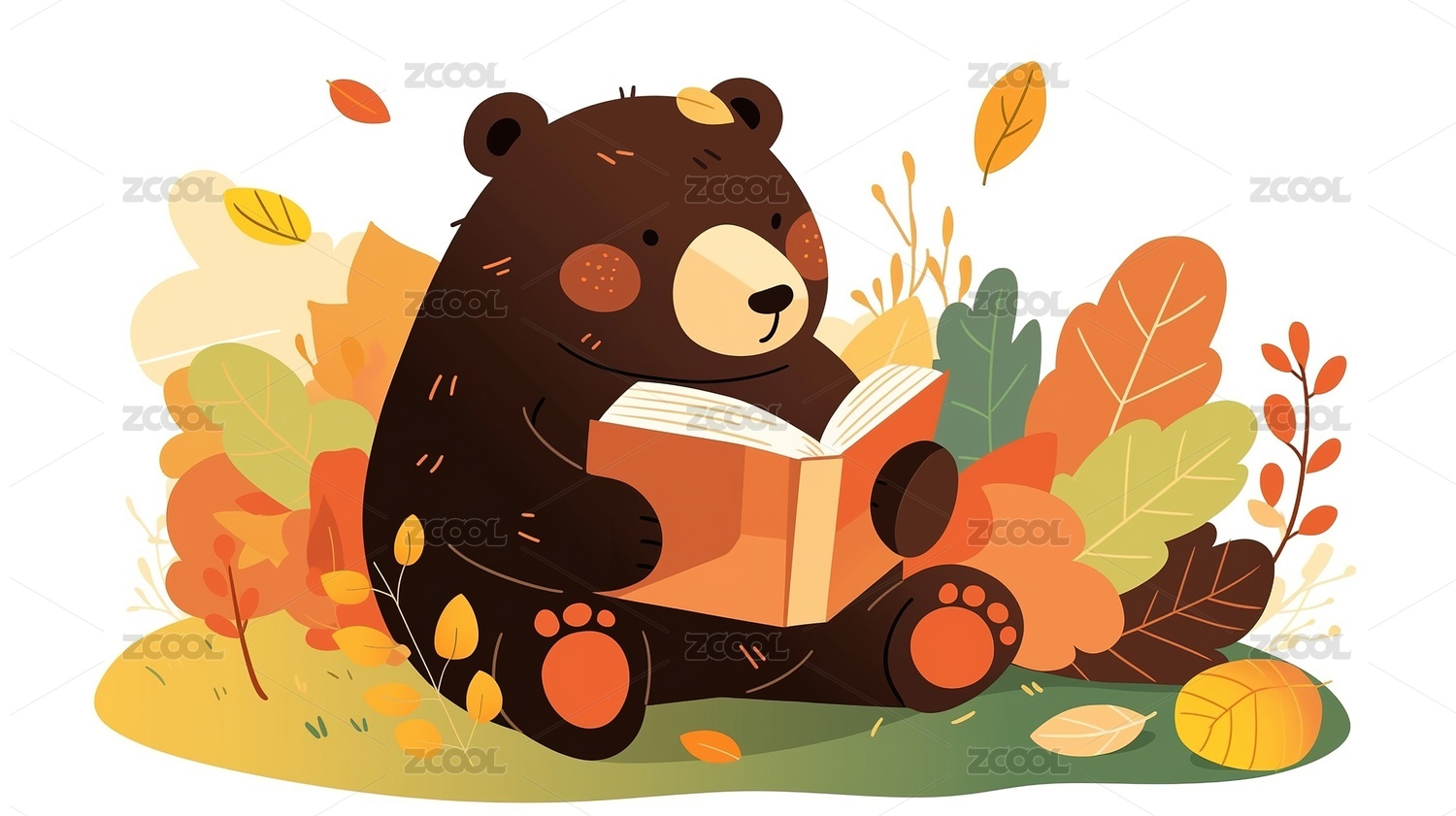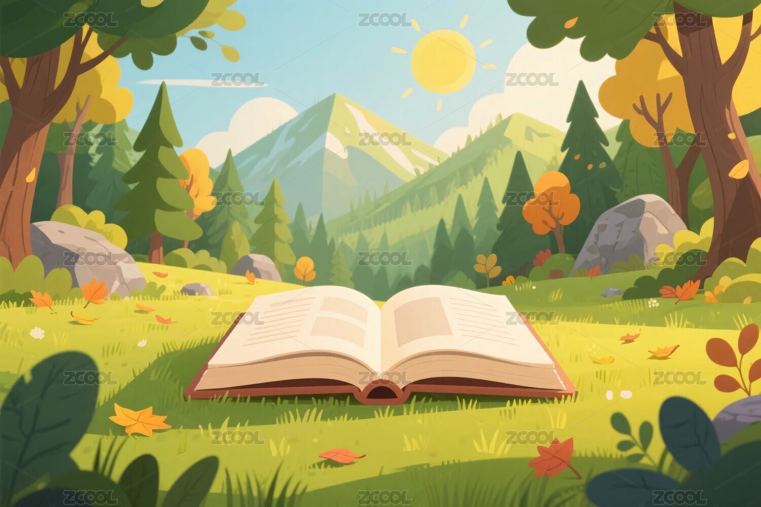 卡通,动物,松鼠,书本,阅读,森林,树木,树叶,花朵,草地