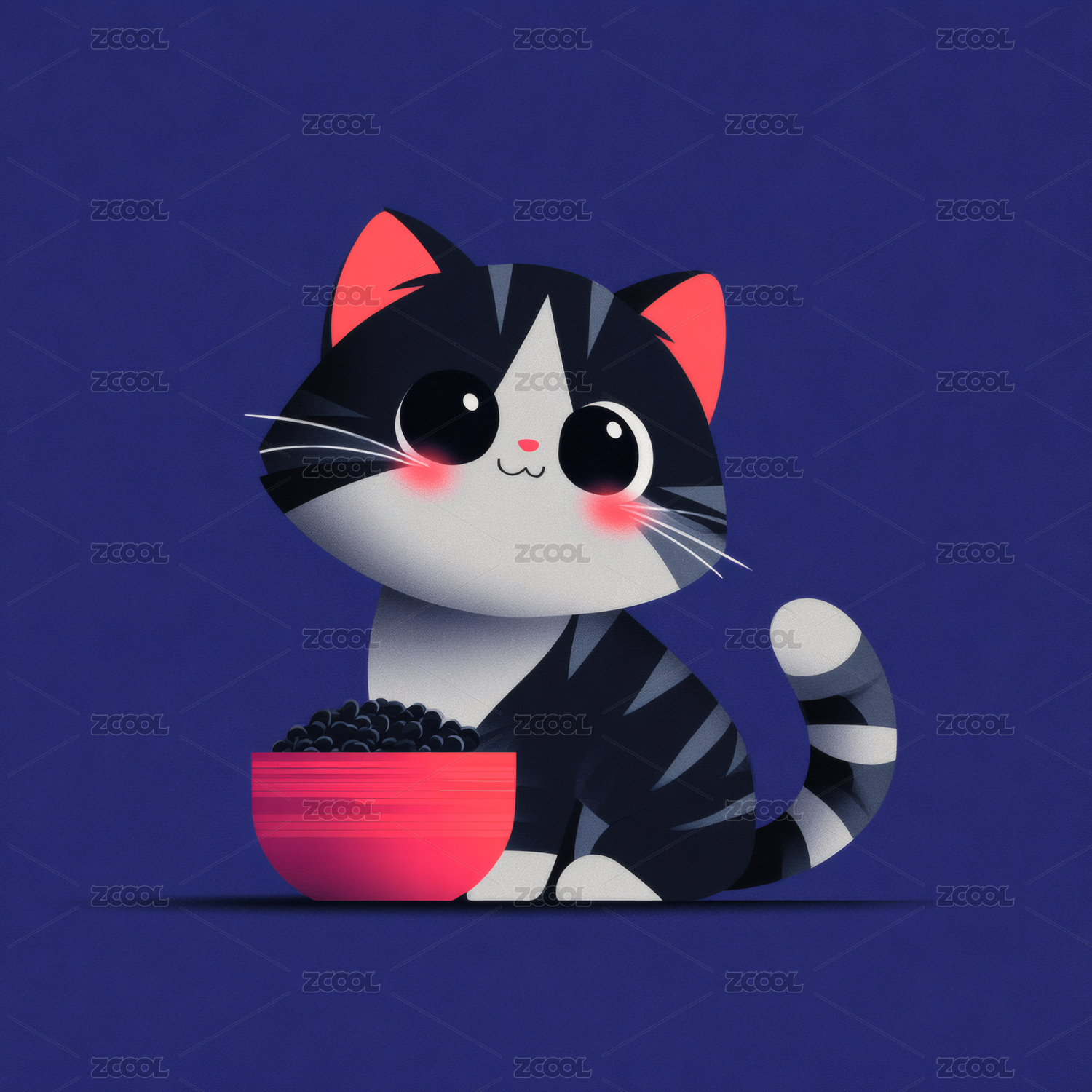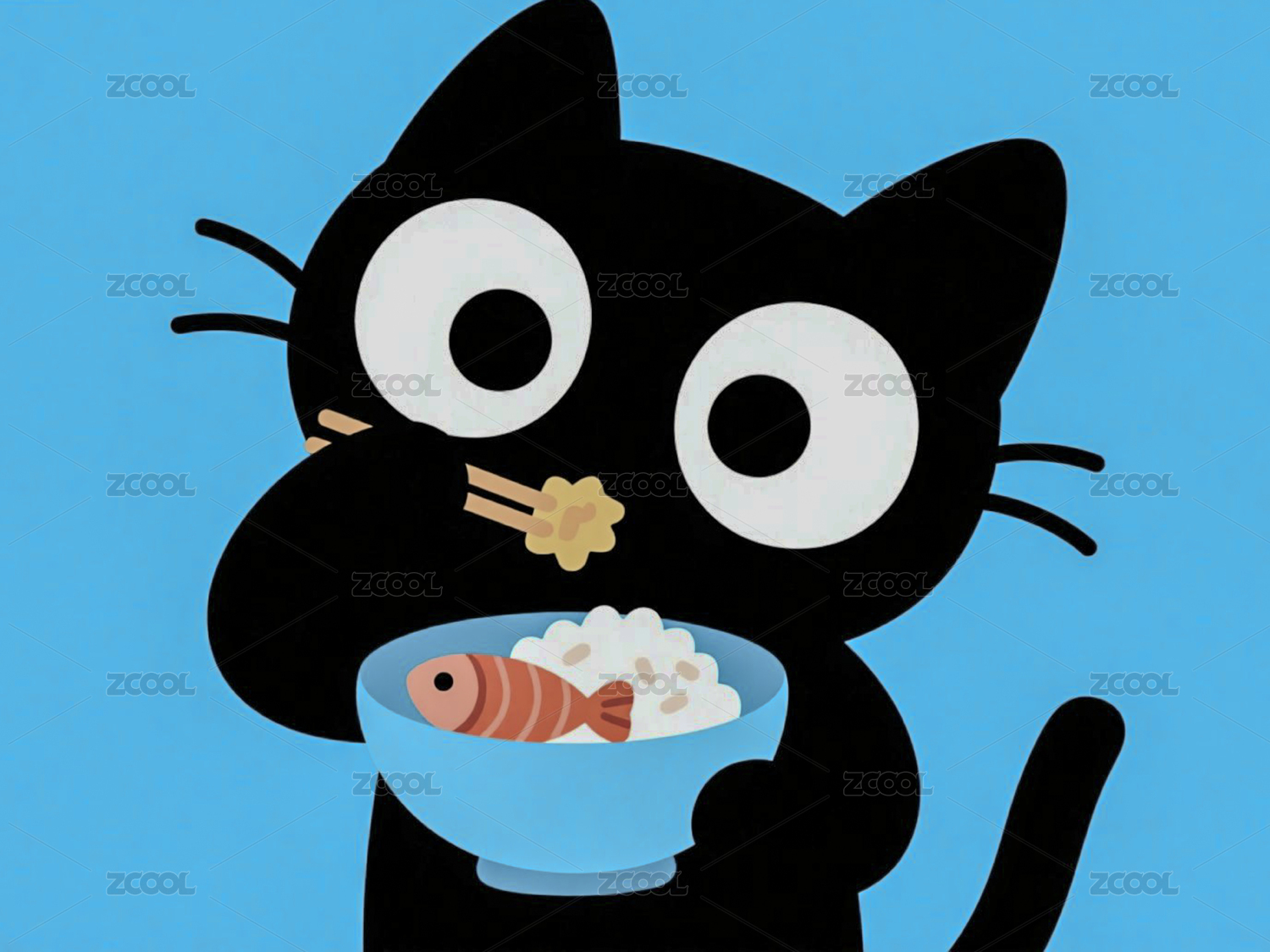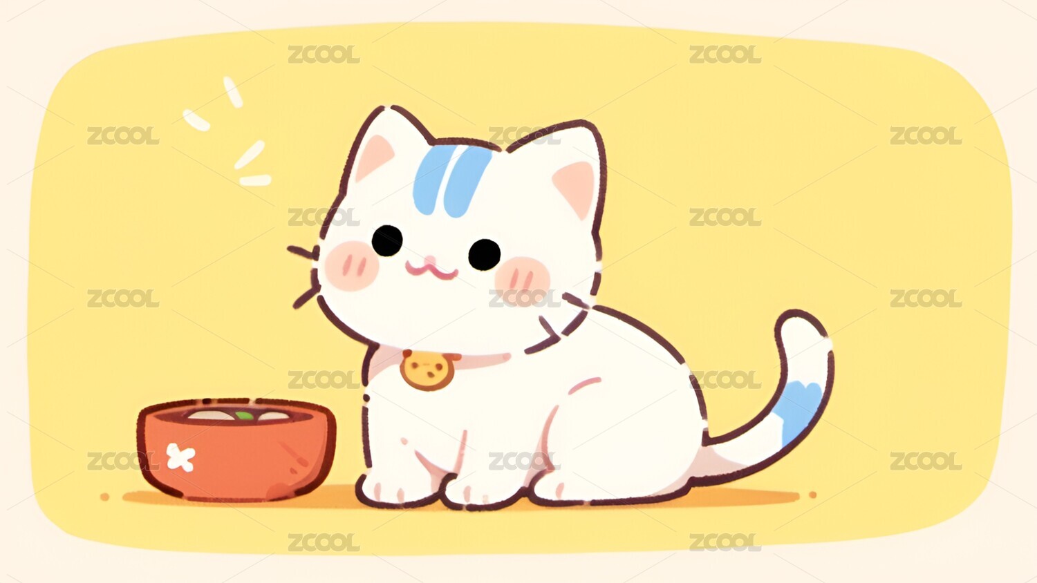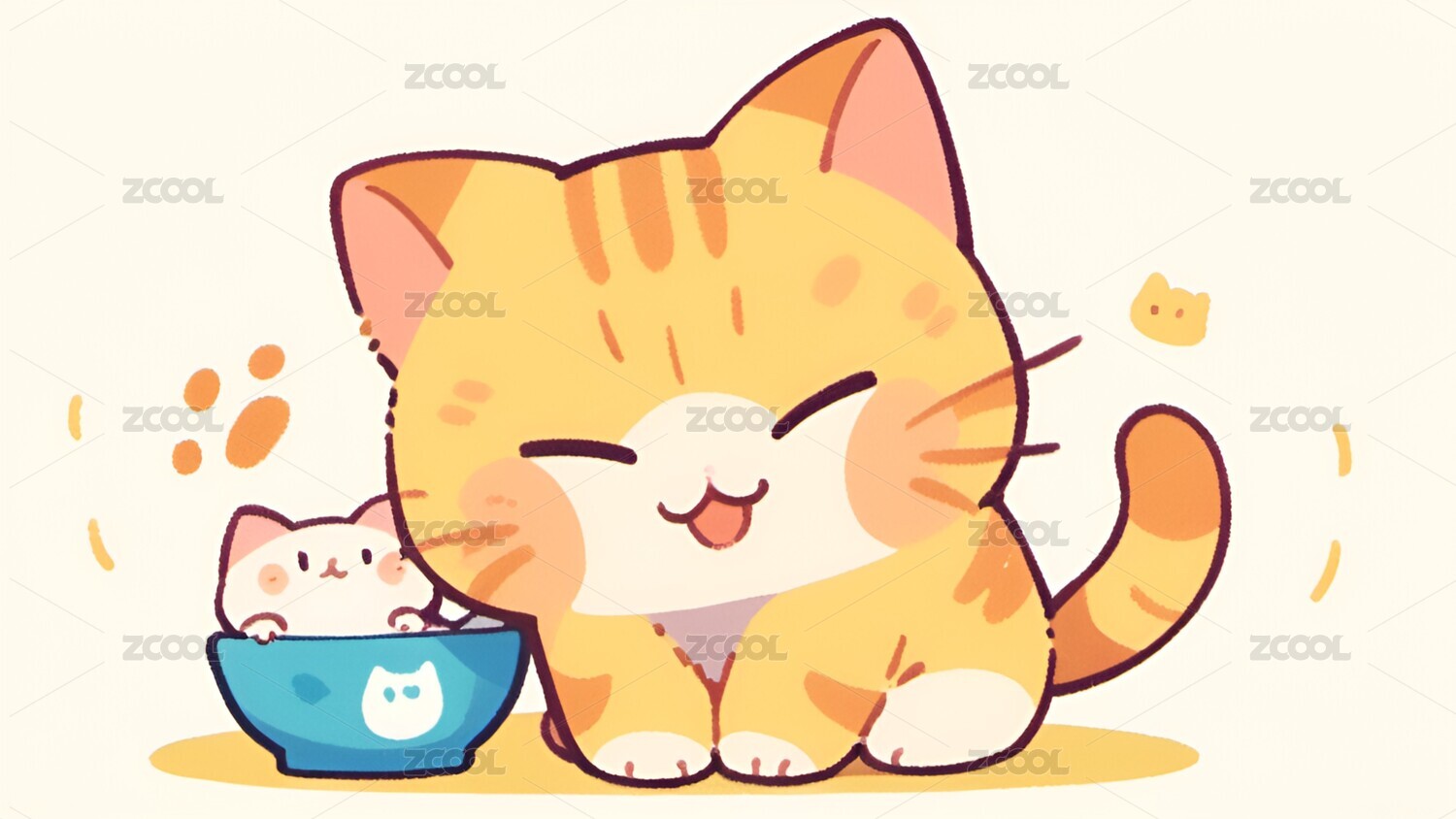 卡通猫咪,可爱小猫,卡通插画,吃饭场景,餐桌,餐碗,食物,碗具,猫咪图案,美食