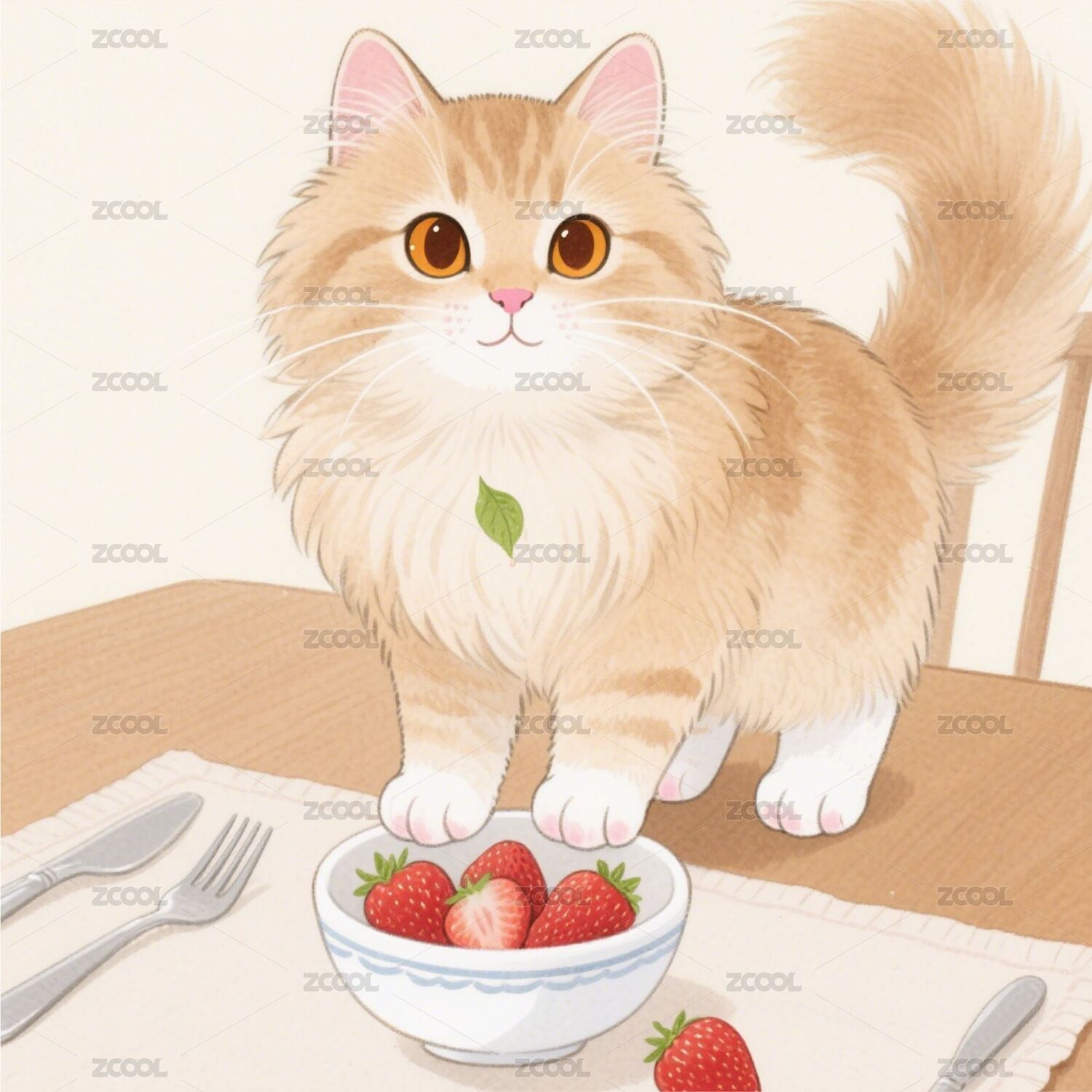 卡通可爱猫吃水果沙拉食物开心温暖治愈插画